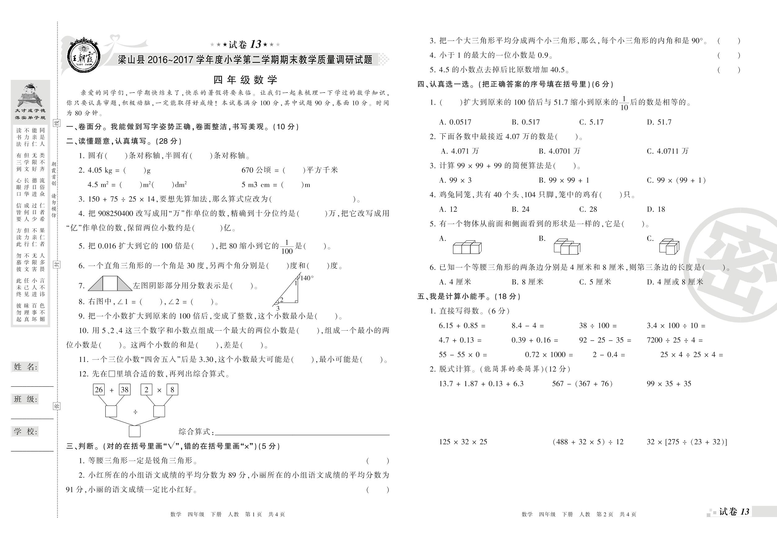 2016-2017学年第二学期济宁市梁山县四年级数学试卷(人教版)【13】
