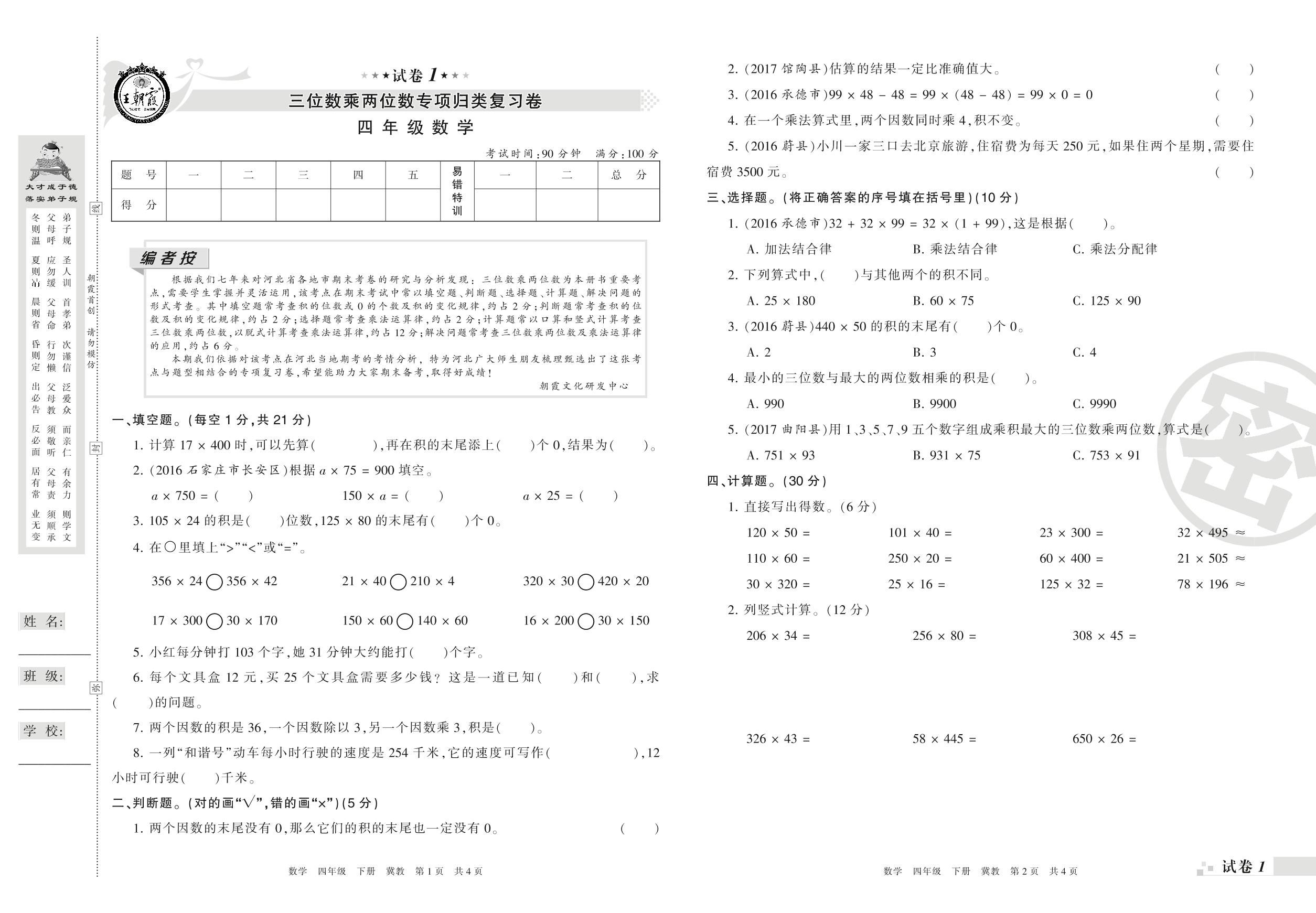 王朝霞期末专项卷——三位数乘两位数专项归类复习卷四年级下册数学(冀教版)_R210804160819【1】