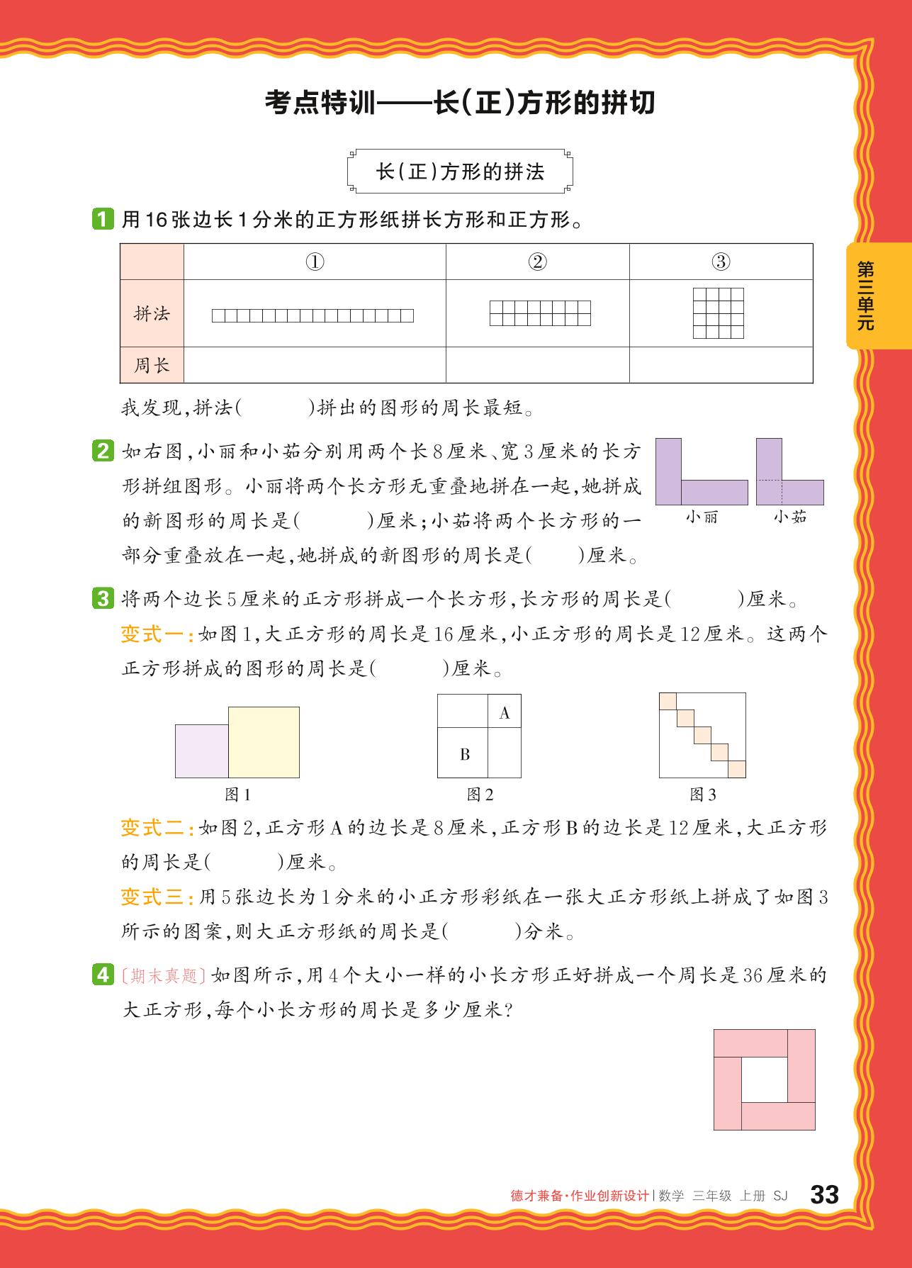 2024秋上册三年级数学苏教版 第三单元 长方形和正方形——考点特训——长(正)方形的拼切