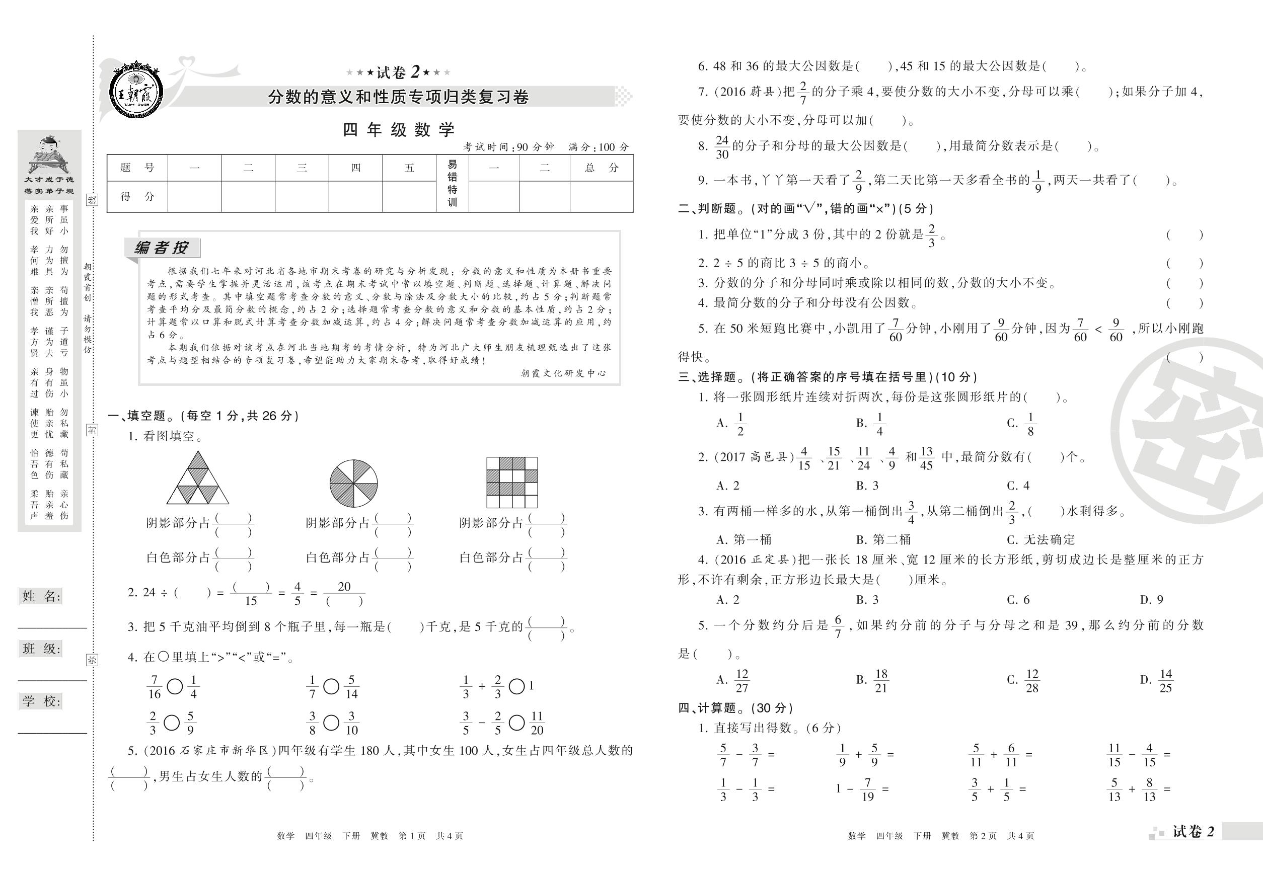 王朝霞期末专项卷——分数的意义和性质专项归类复习卷四年级下册数学(冀教版)_R210804160824【2】