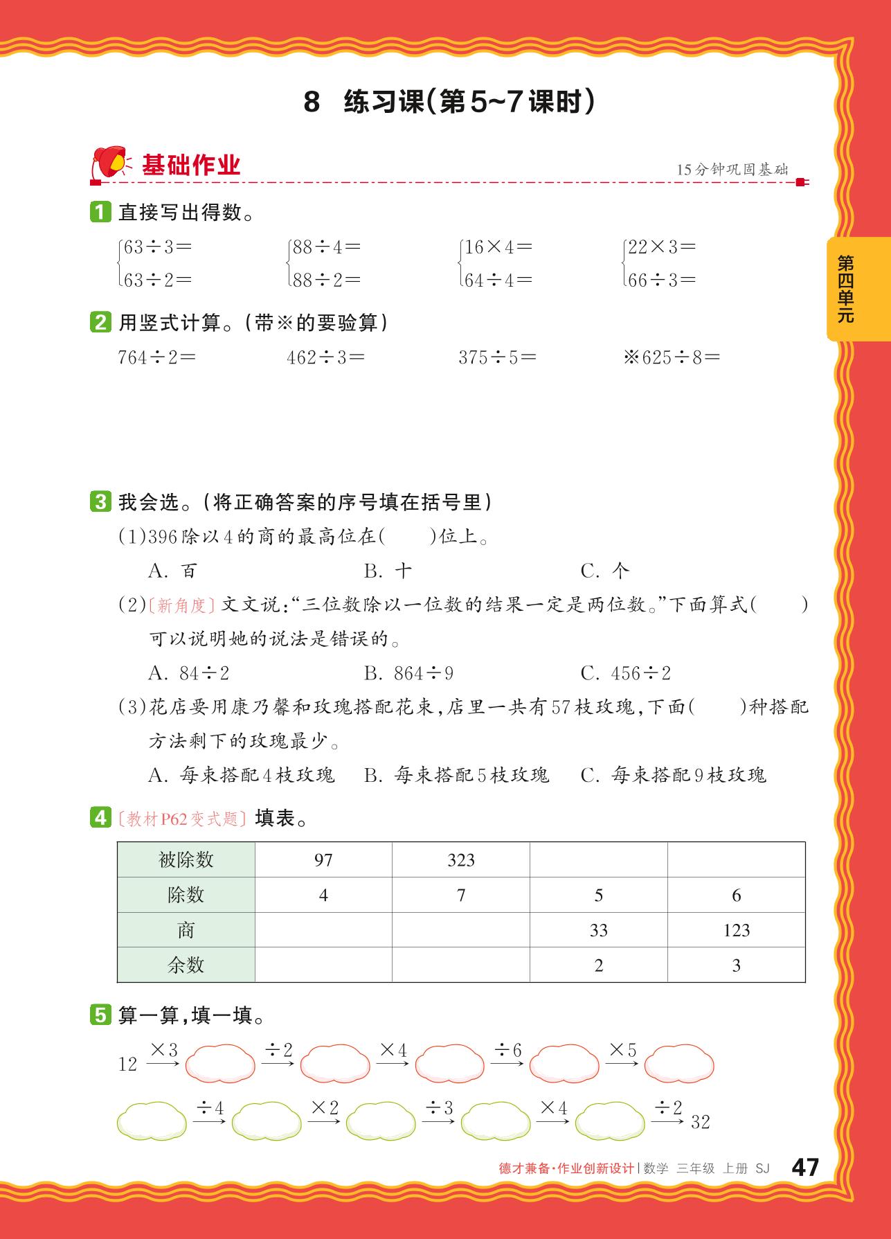2024秋上册三年级数学苏教版 第四单元 两、三位数除以一位数——8. 笔算两位数除以一位数(首位不能整除)、笔算三位数除以一位数(首位不能整除、不够除)练习课