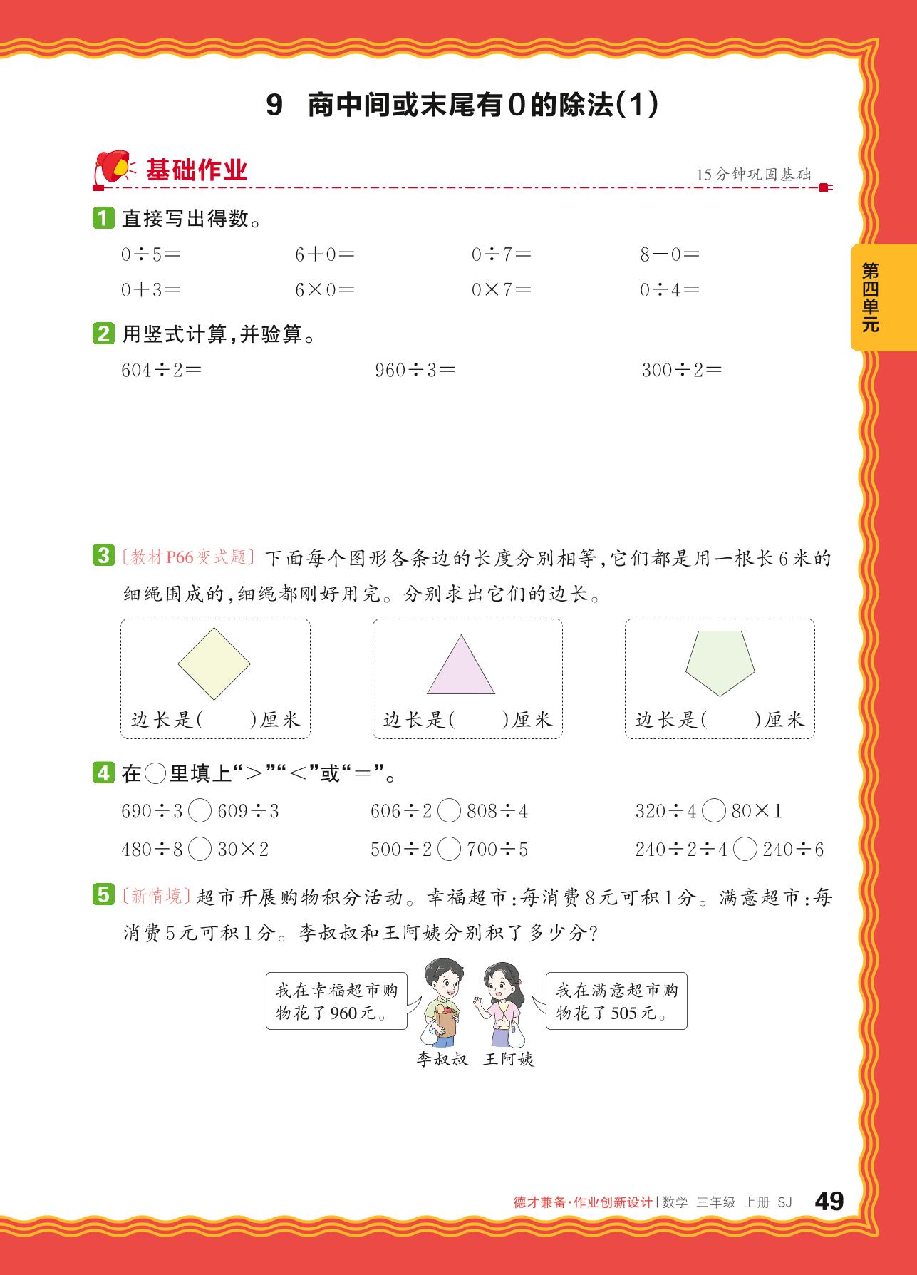 2024秋上册三年级数学苏教版 第四单元 两、三位数除以一位数——9. 商中间或末尾有0的除法(1)
