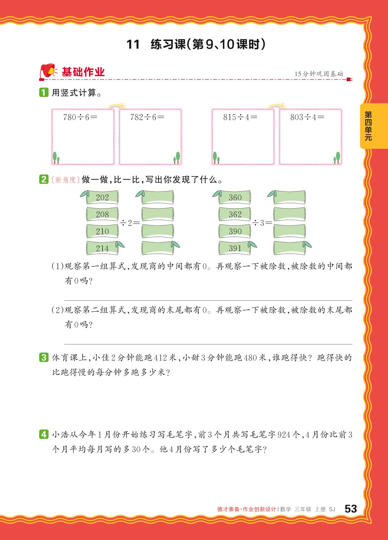 2024秋上册三年级数学苏教版 第四单元 两、三位数除以一位数——11. 商中间或末尾有0的除法练习课