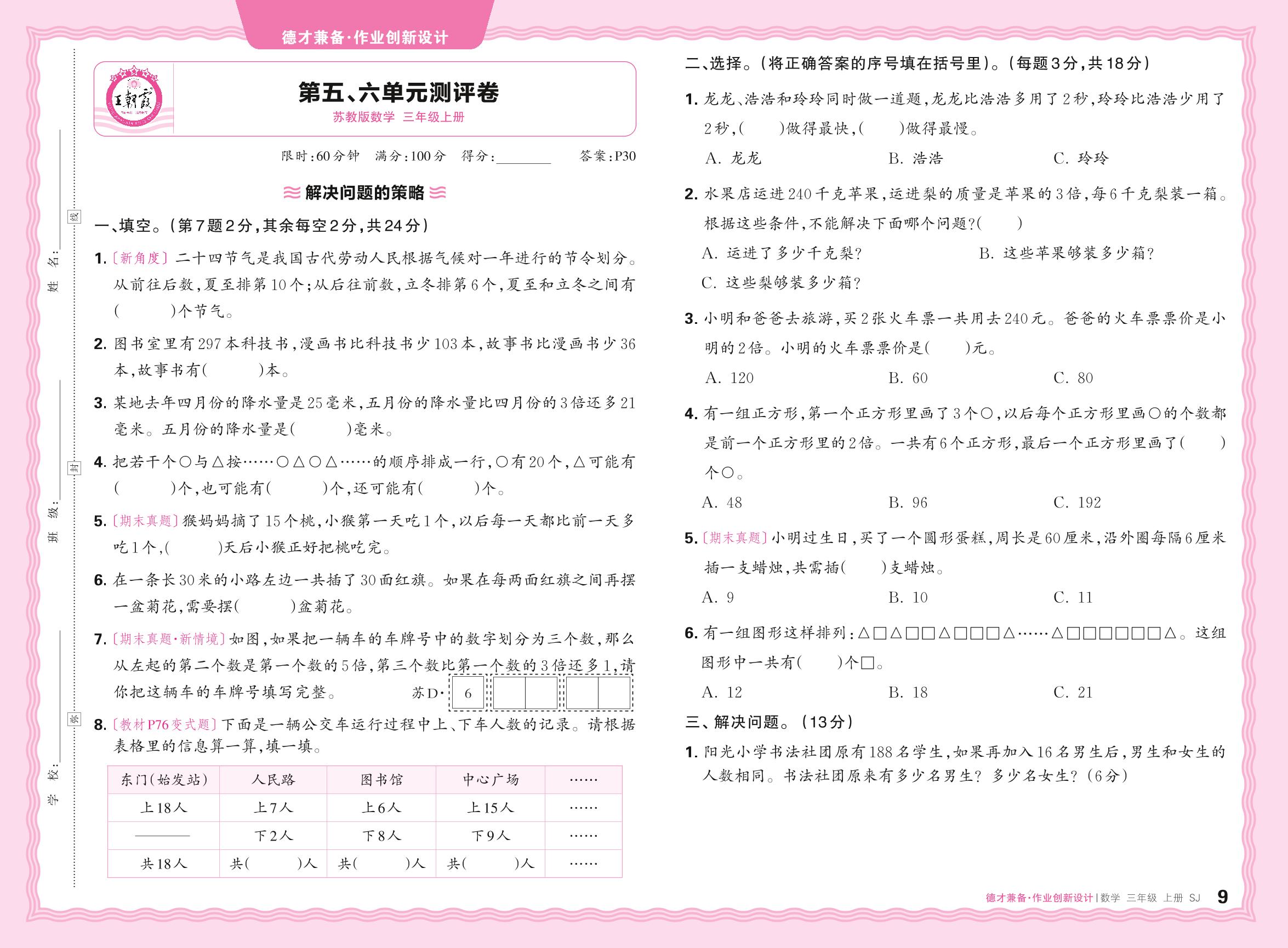 2024秋上册三年级数学苏教版 第五、六单元测评卷