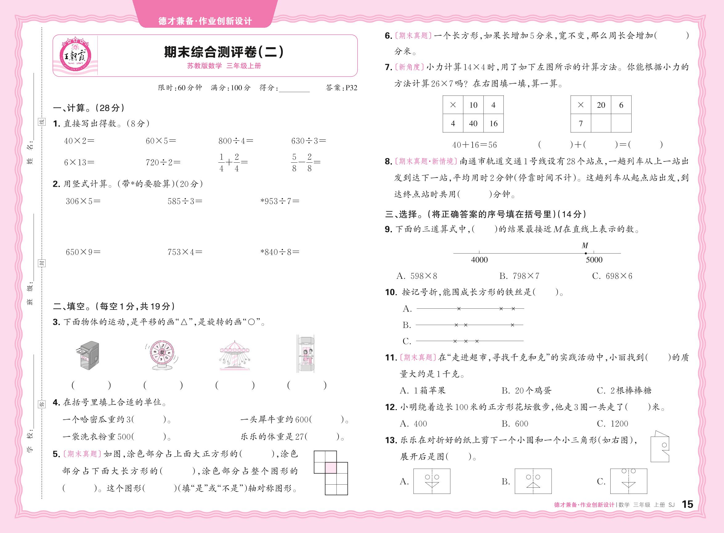 三年级数学苏教版上册期末卷