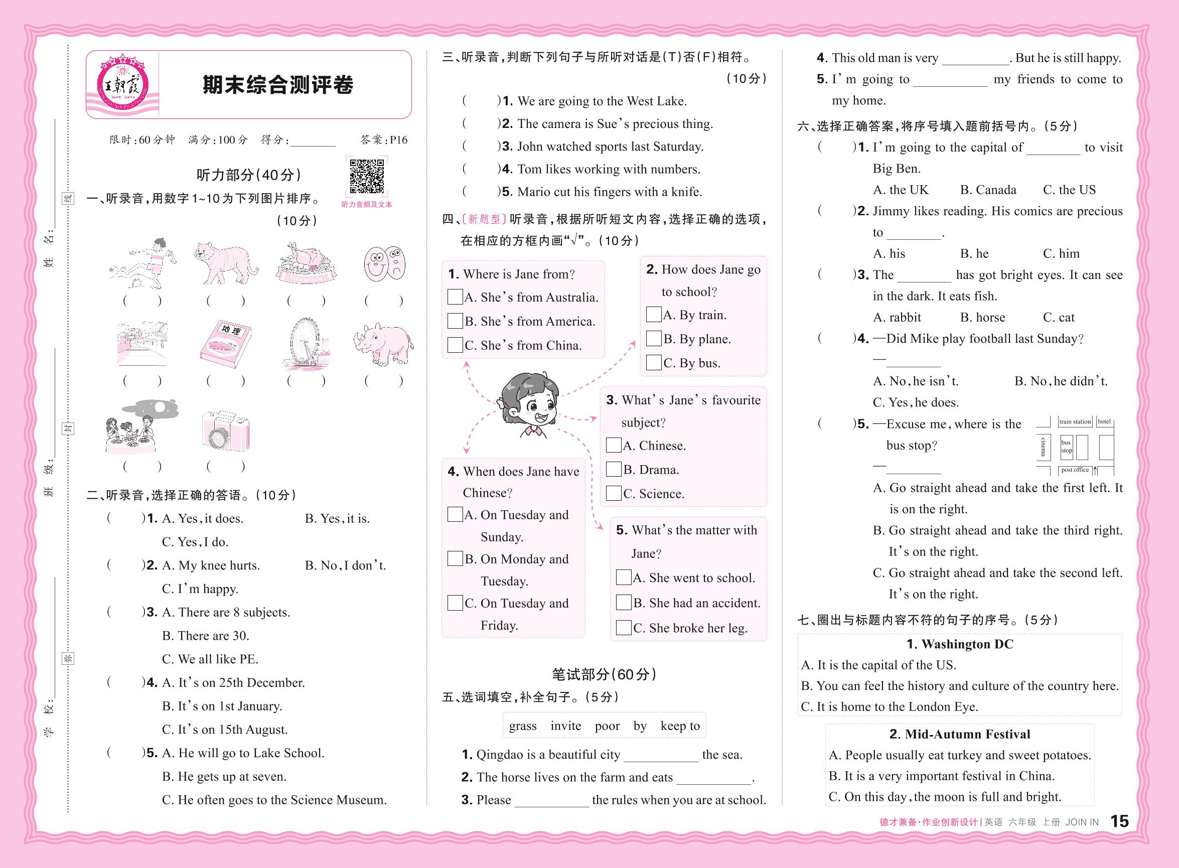 2024秋上册六年级英语剑桥版 期末综合测评卷