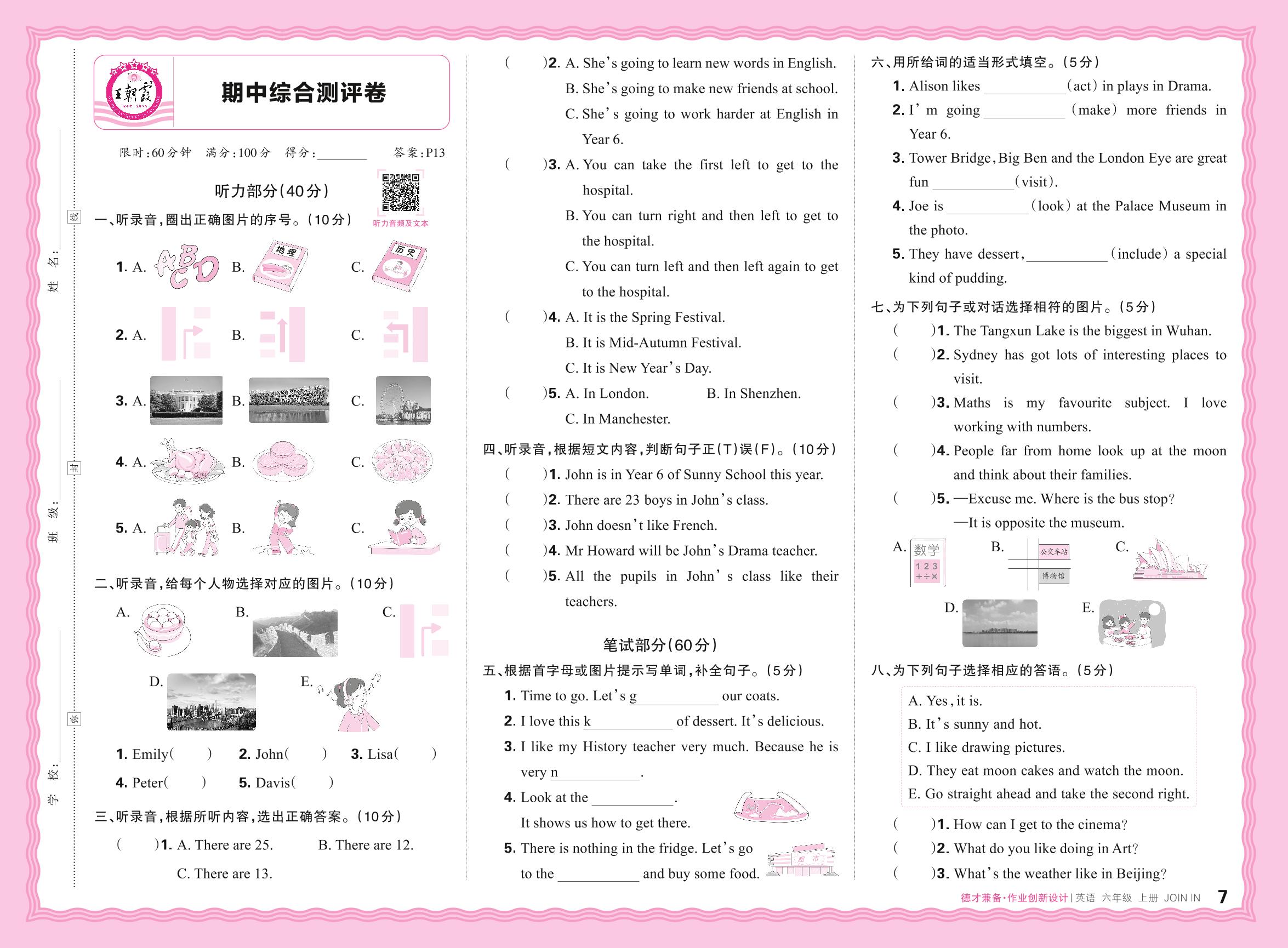 2024秋上册六年级英语剑桥版 期中综合测评卷
