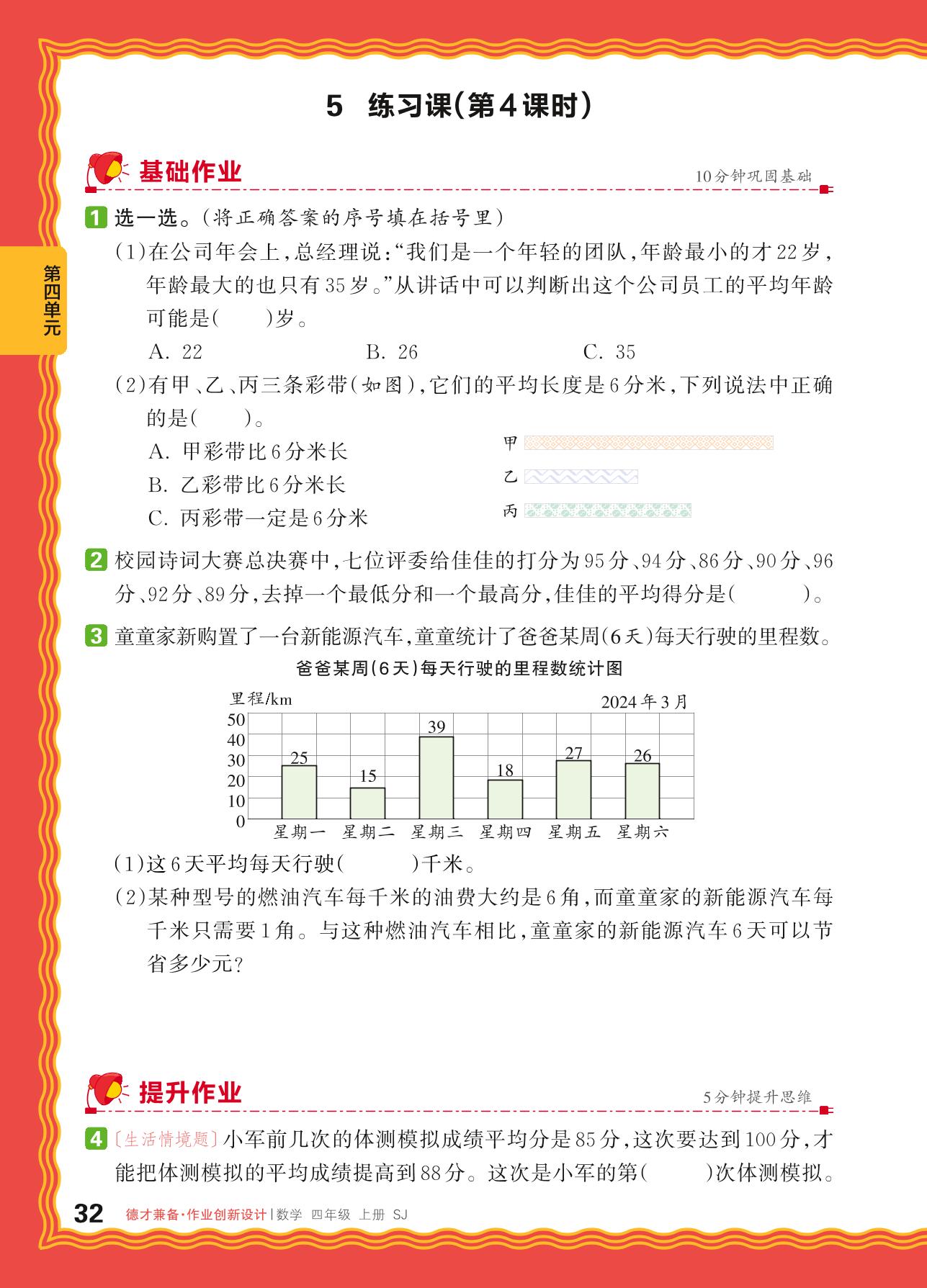 2024秋上册四年级数学苏教版 第四单元 统计表和条形统计图(一)——5. 平均数练习课