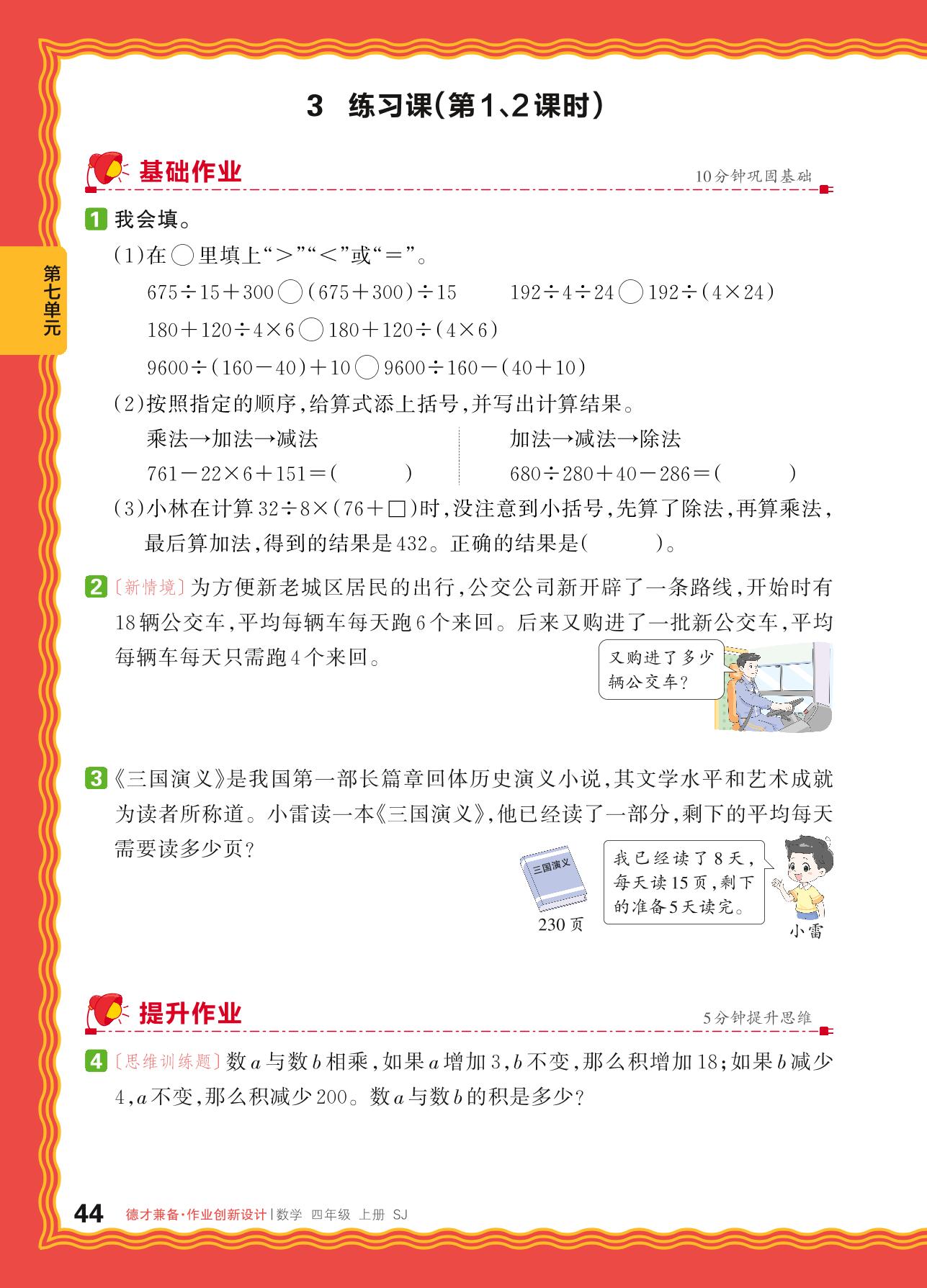 2024秋上册四年级数学苏教版 第七单元 整数四则混合运算——3. 不含括号、含有小括号的混合运算练习课