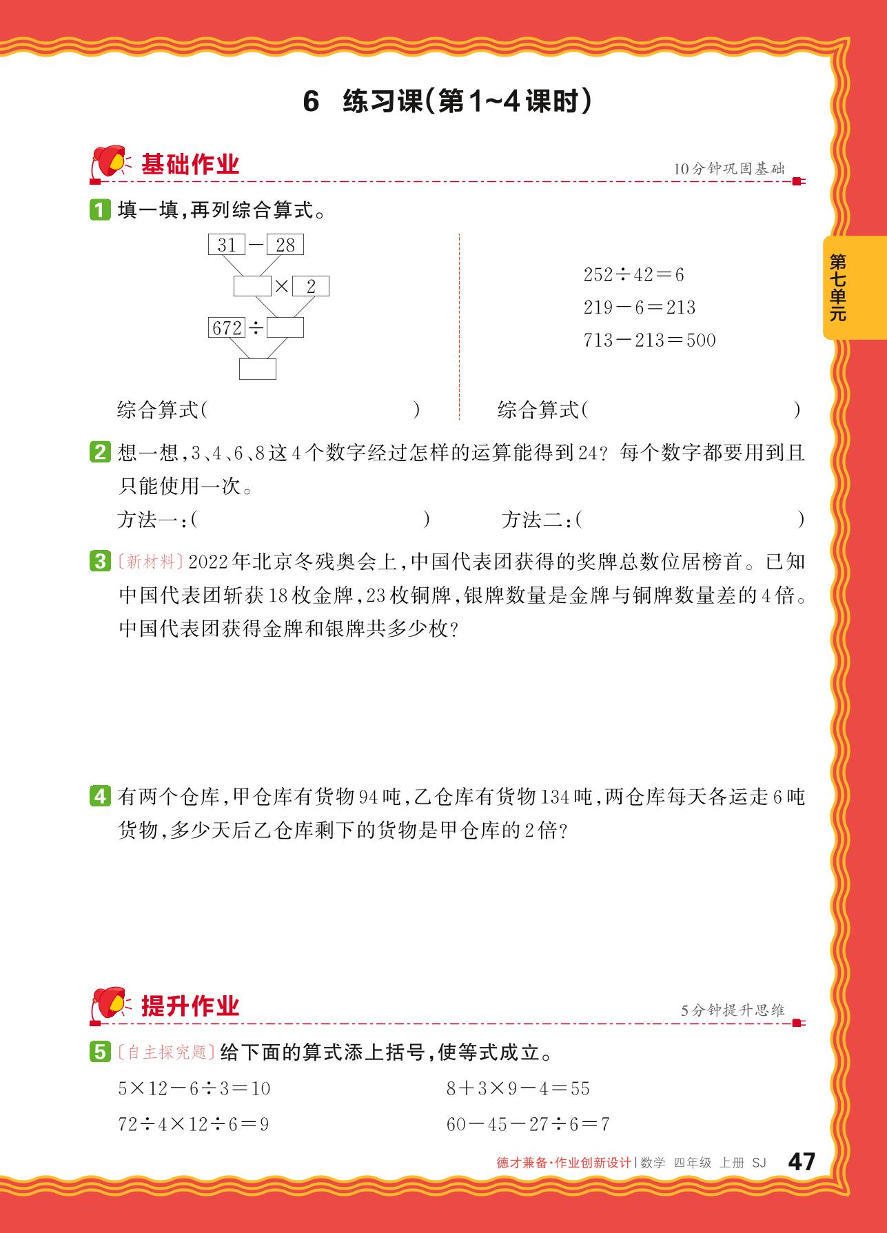 2024秋上册四年级数学苏教版 第七单元 整数四则混合运算——6. 整数四则混合运算练习课