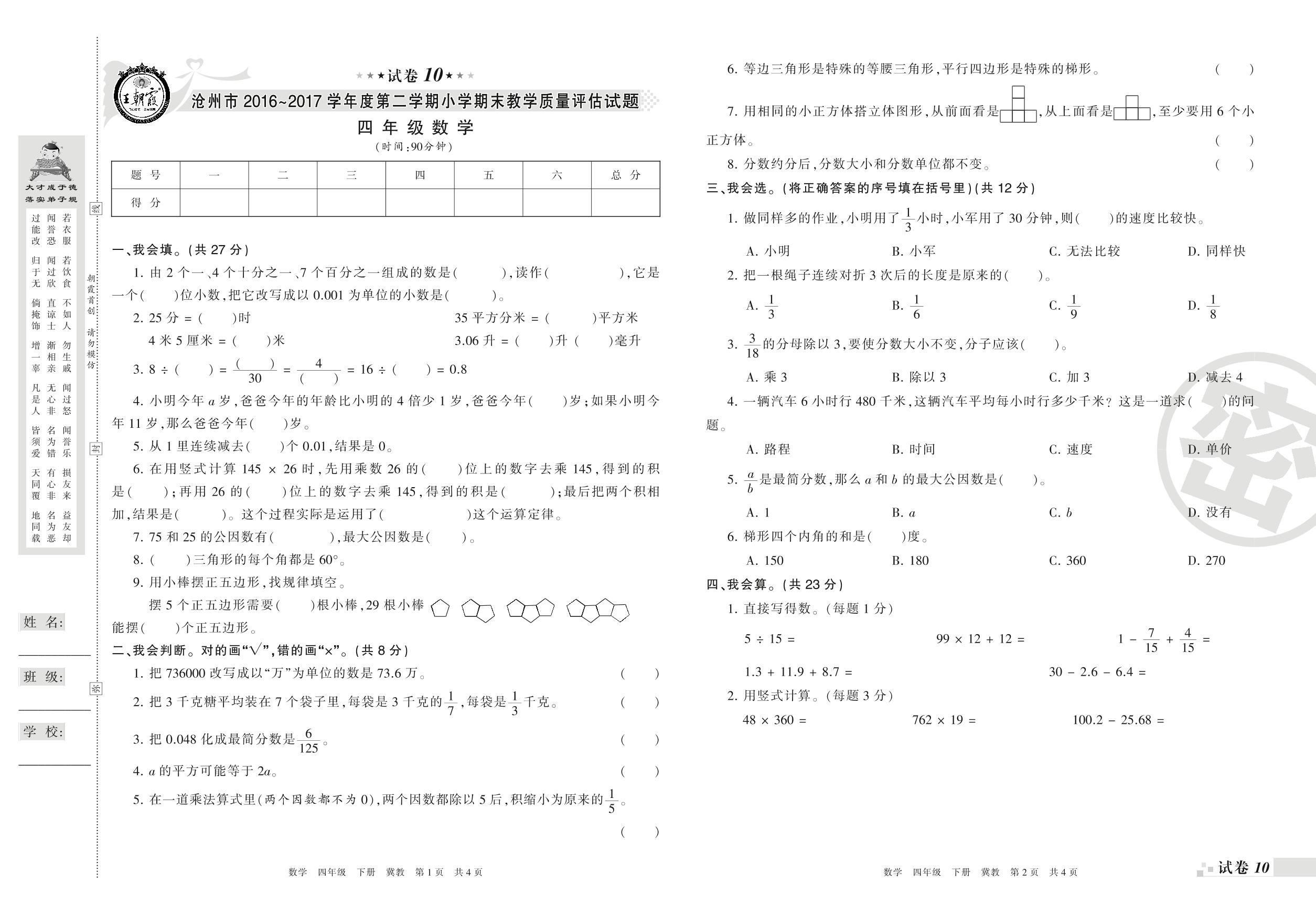 2016-2017学年第二学期沧州市四年级数学试卷(冀教版)【10】