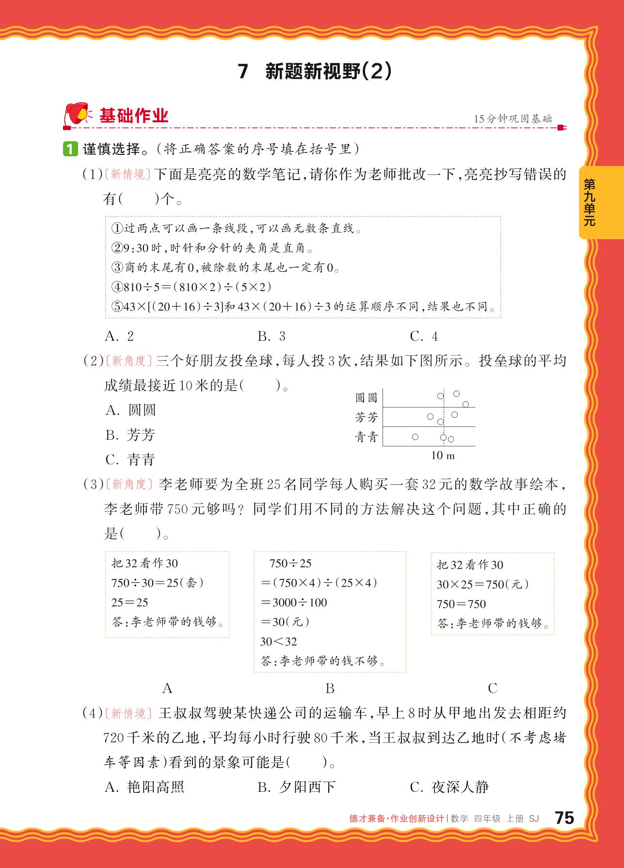 2024秋上册四年级数学苏教版 第九单元 整理与复习——7. 新题新视野(2)