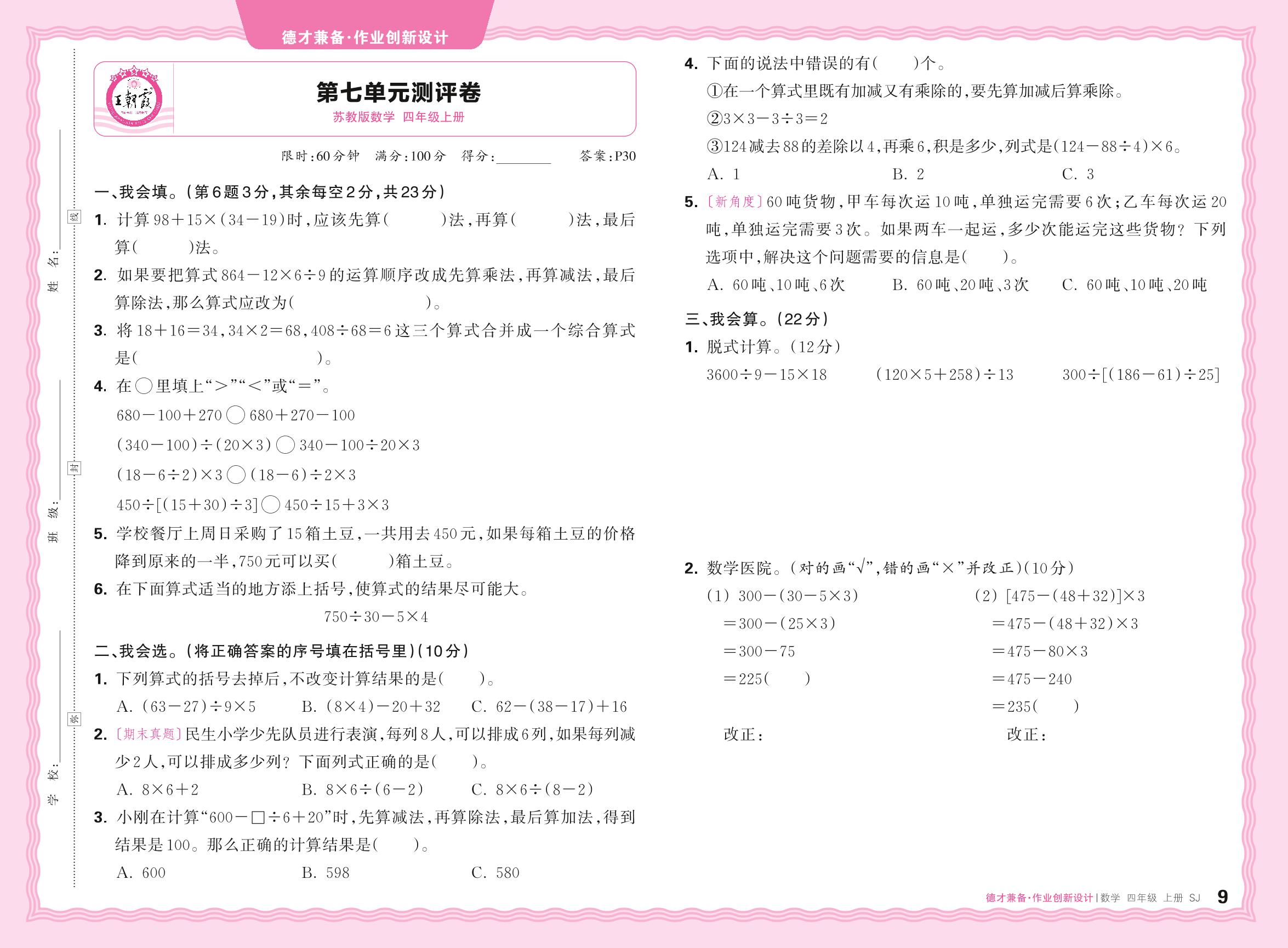 四年级数学苏教版上册单元卷