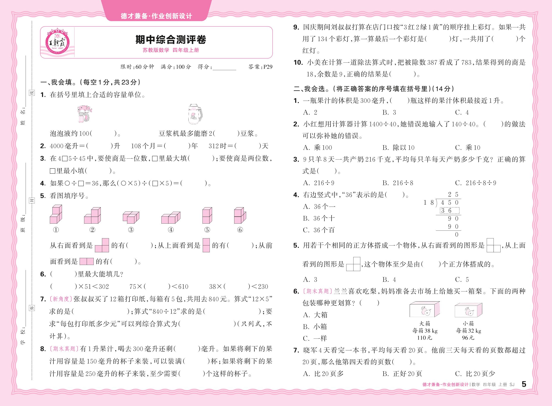 2024秋上册四年级数学苏教版 期中综合测评卷