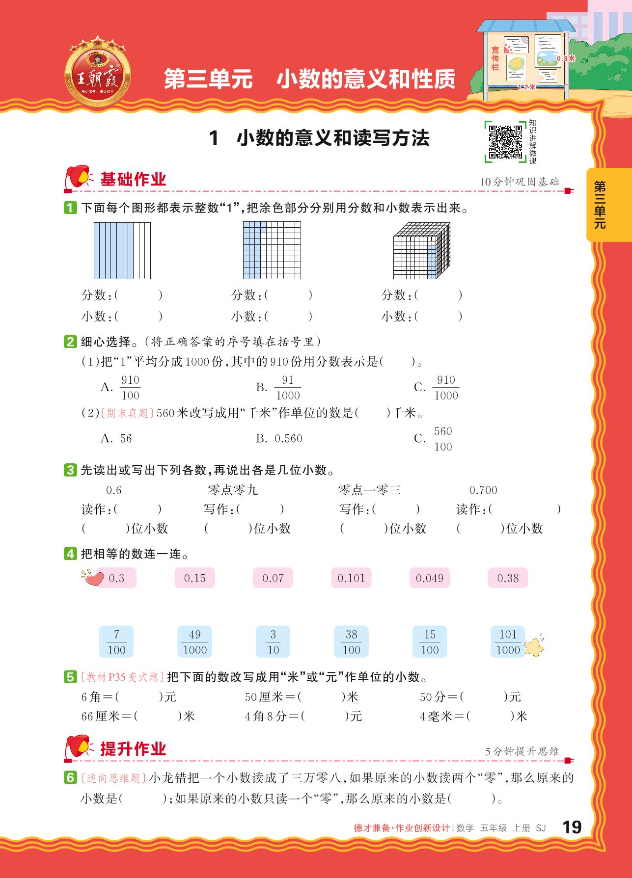 2024秋上册五年级数学苏教版 第三单元 小数的意义和性质——1. 小数的意义和读写方法