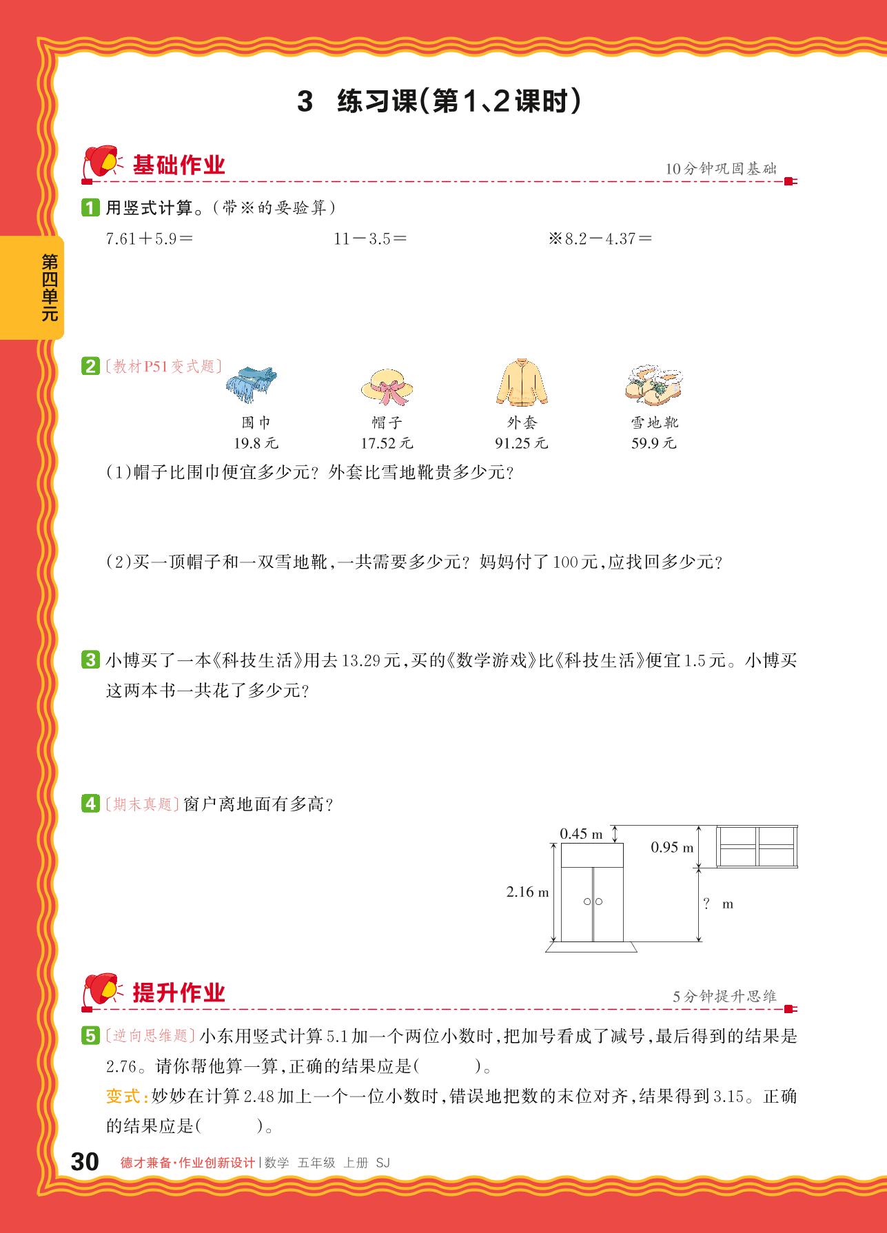2024秋上册五年级数学苏教版 第四单元 小数加法和减法——3. 笔算小数加法和减法练习课