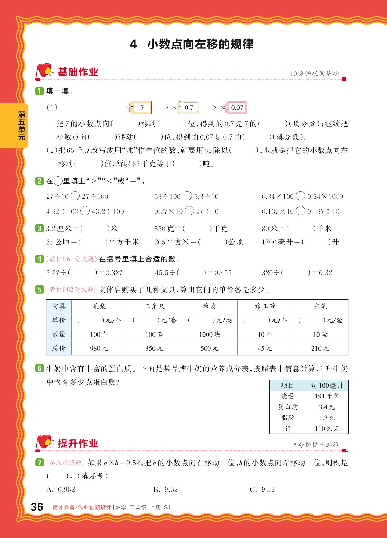 2024秋上册五年级数学苏教版 第五单元 小数乘法和除法——4. 小数点向左移的规律