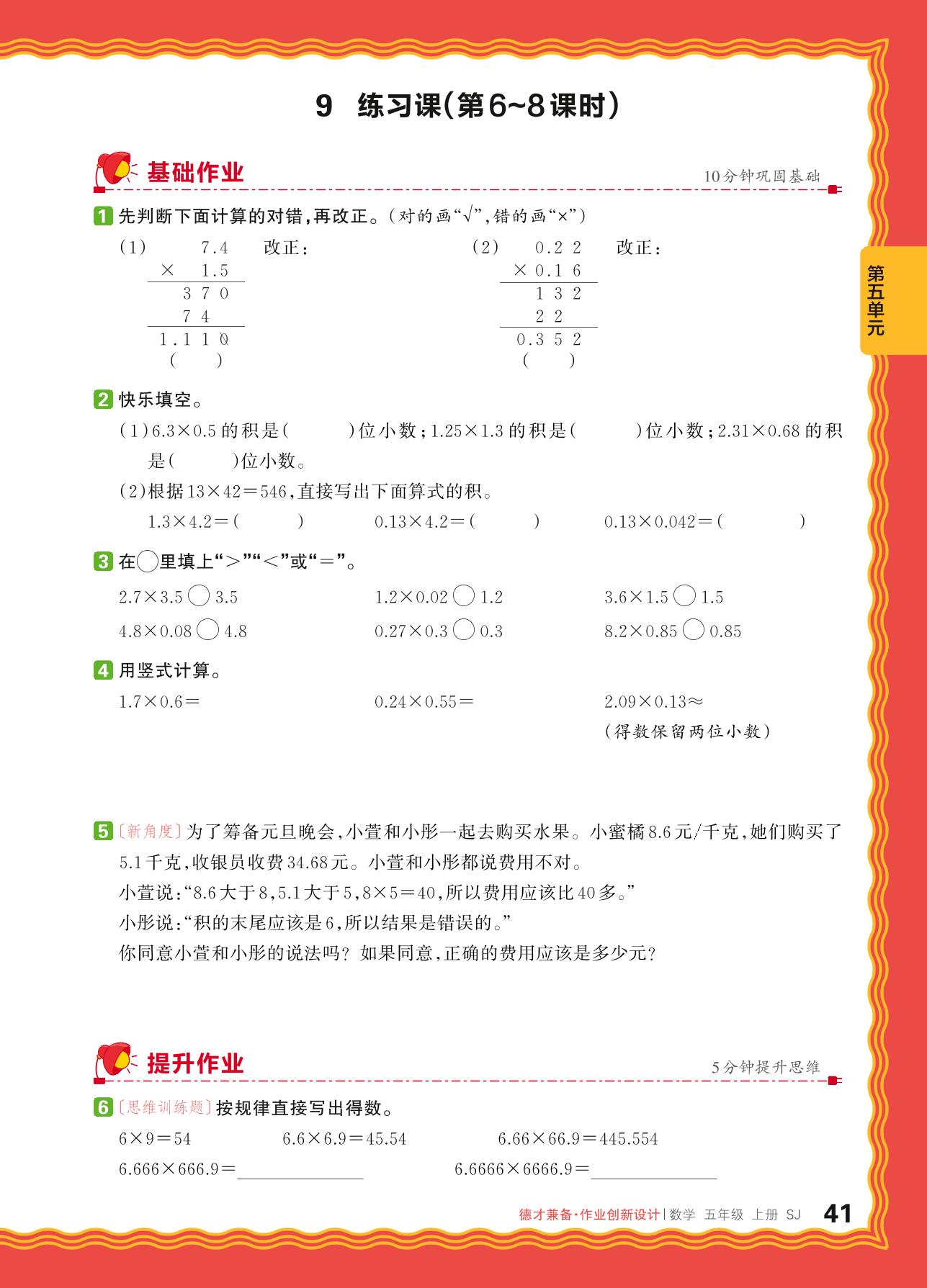 2024秋上册五年级数学苏教版 第五单元 小数乘法和除法——9. 小数乘小数、积的近似值练习课