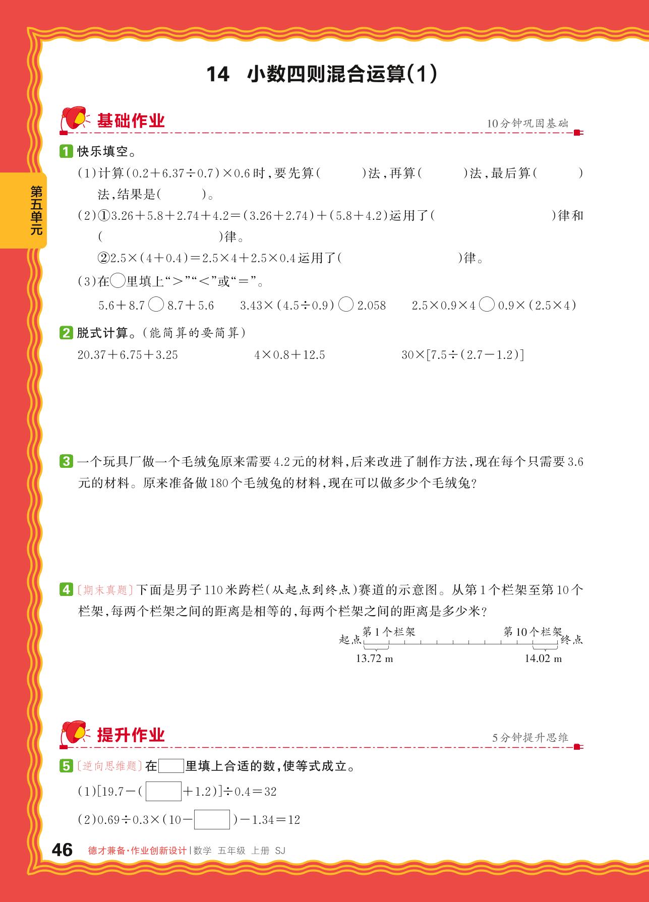 2024秋上册五年级数学苏教版 第五单元 小数乘法和除法——14. 小数四则混合运算(1)