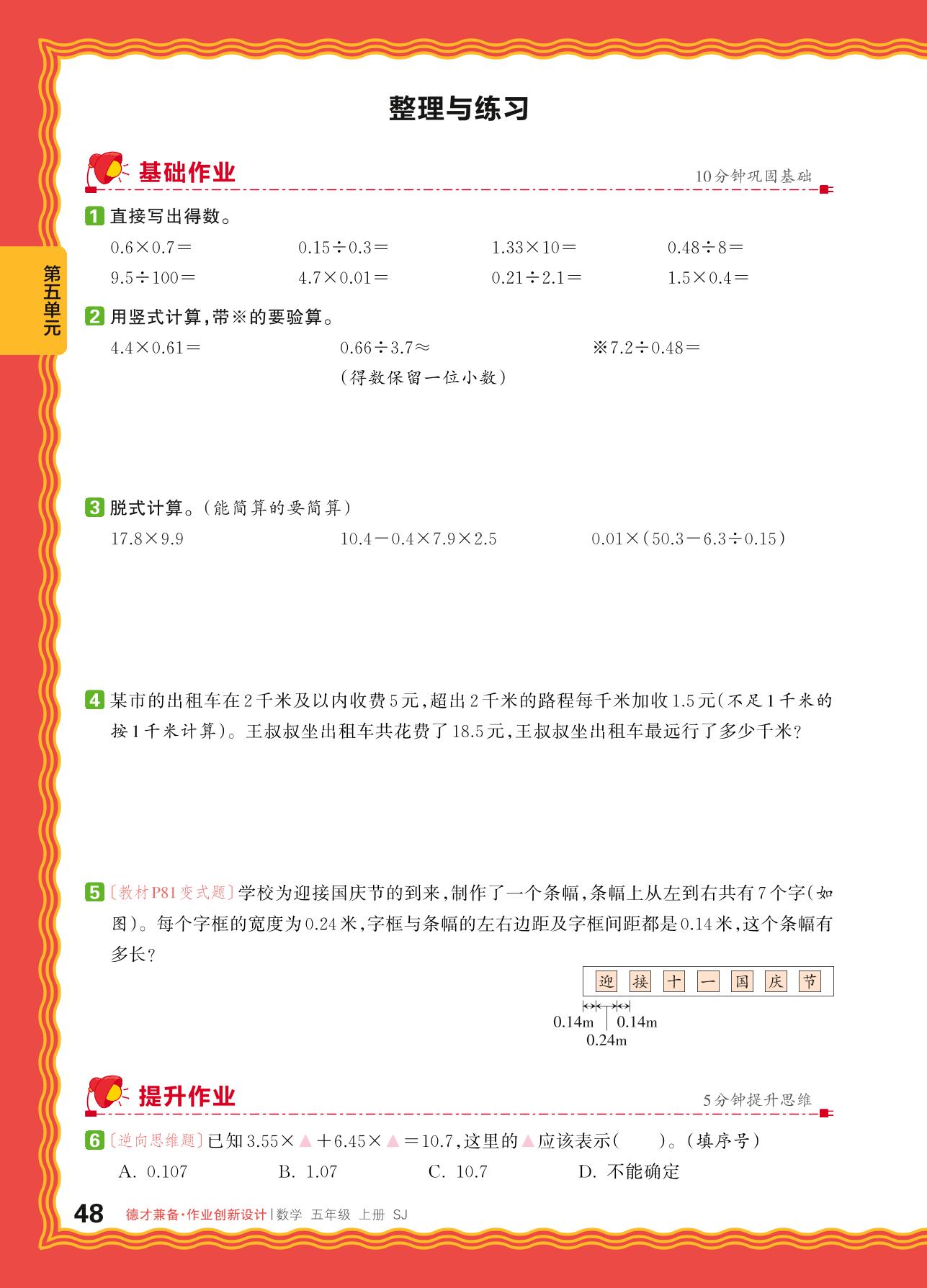 2024秋上册五年级数学苏教版 第五单元 小数乘法和除法——整理与练习