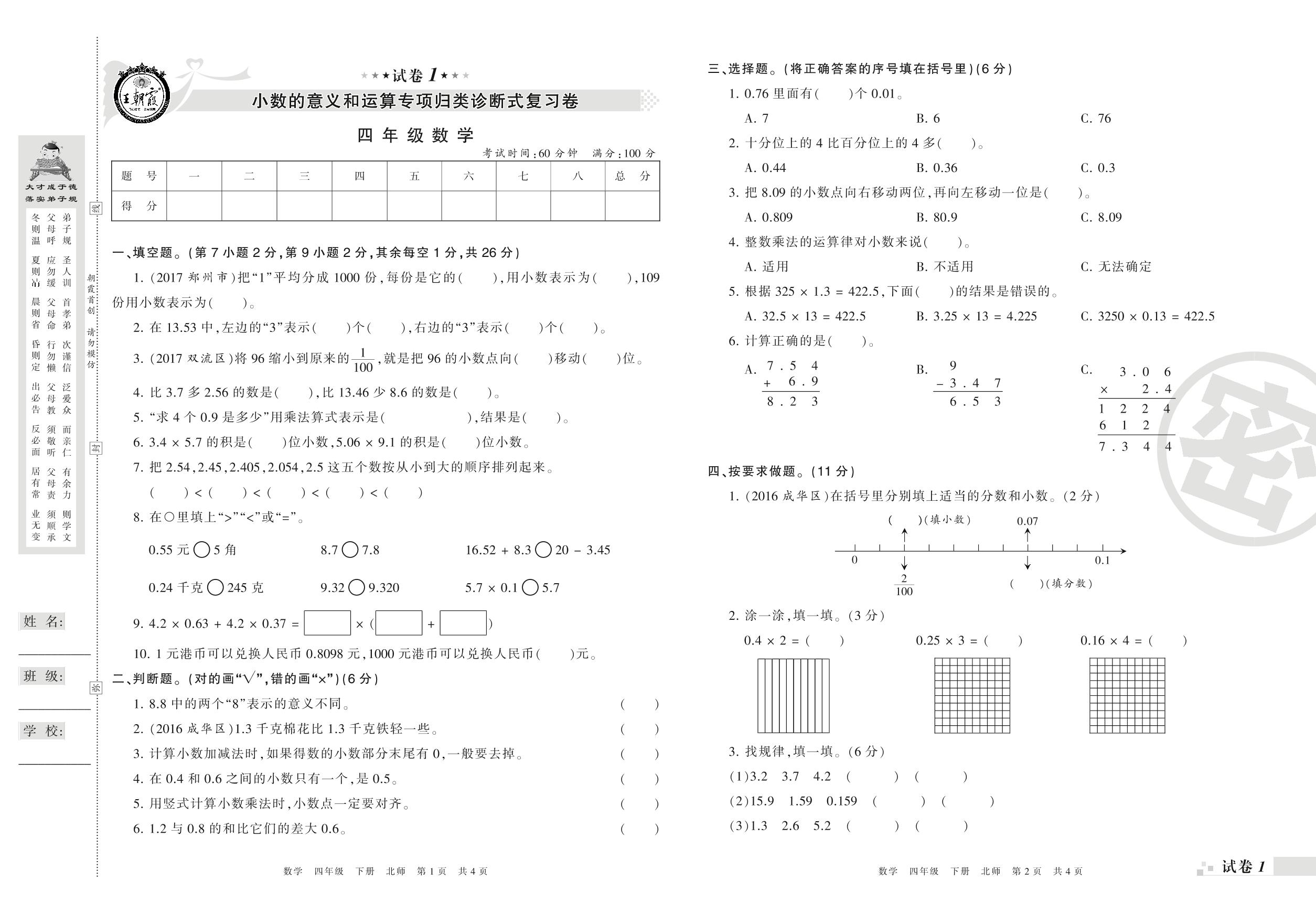 王朝霞期末专项卷——小数的意义和运算专项归类诊断式复习卷四年级下册数学(北师版)_R210804160924【1】