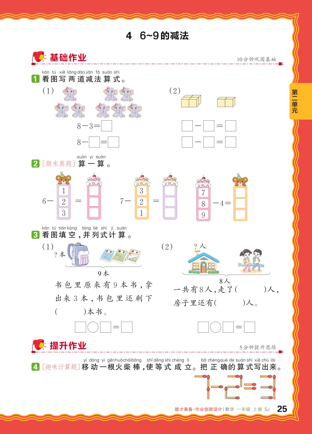 2024秋上册一年级数学苏教版 第二单元 6~9的认识和加减法——4. 6~9的减法