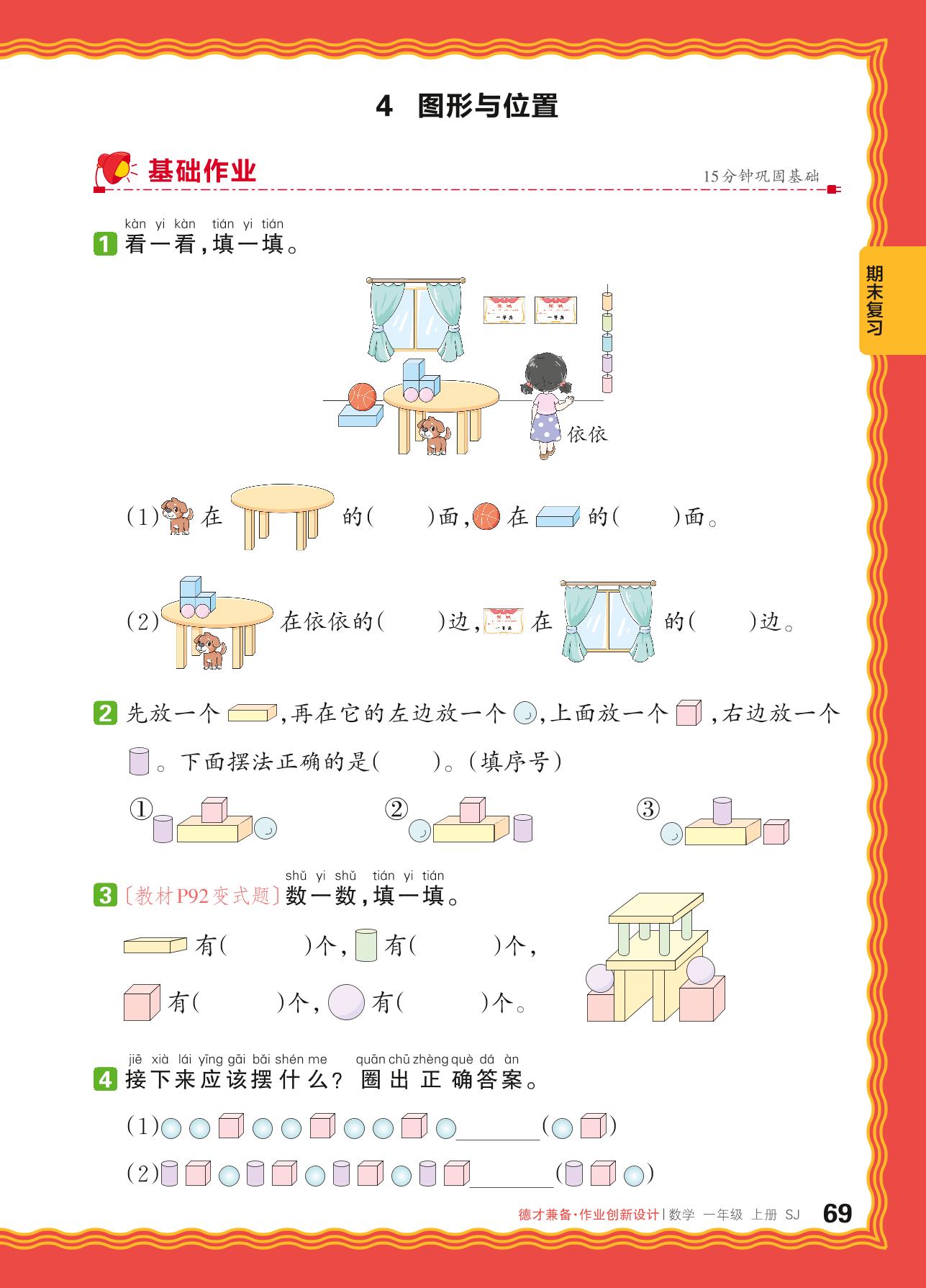 2024秋上册一年级数学苏教版 期末复习——4. 图形与位置