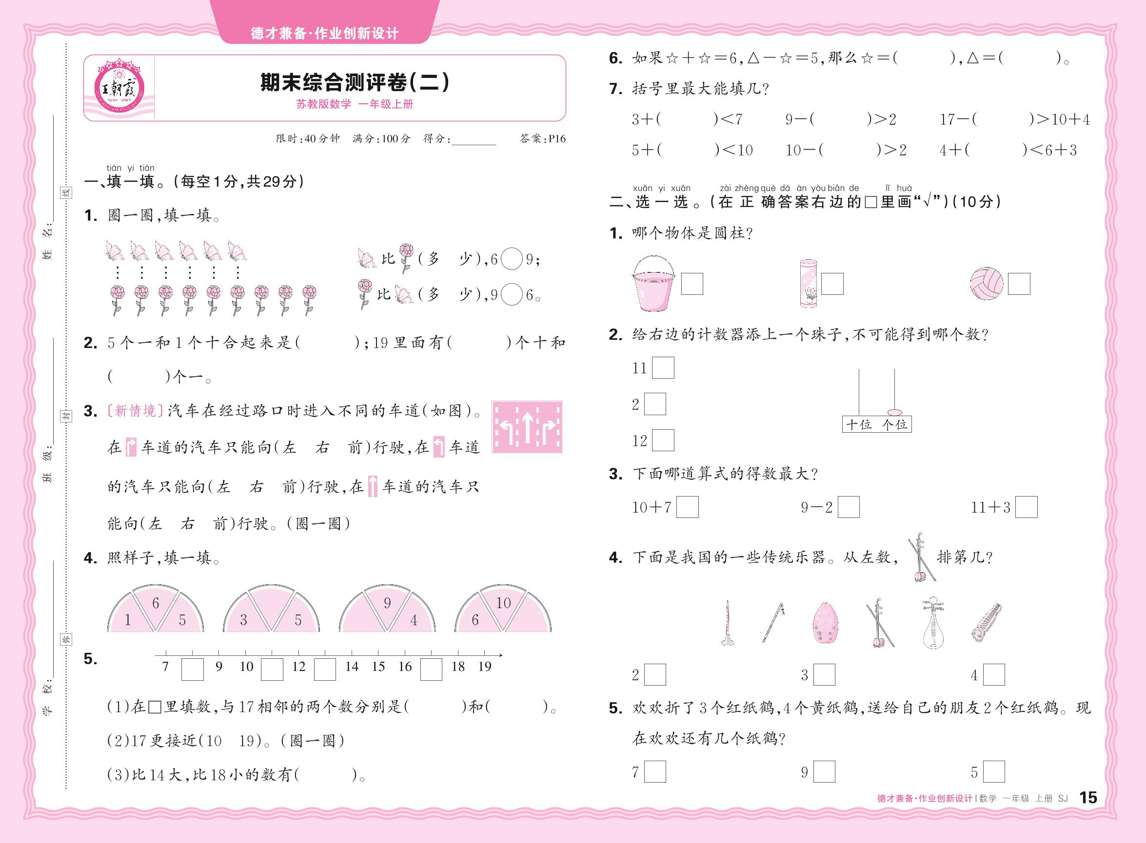 2024秋上册一年级数学苏教版 期末综合测评卷(二)