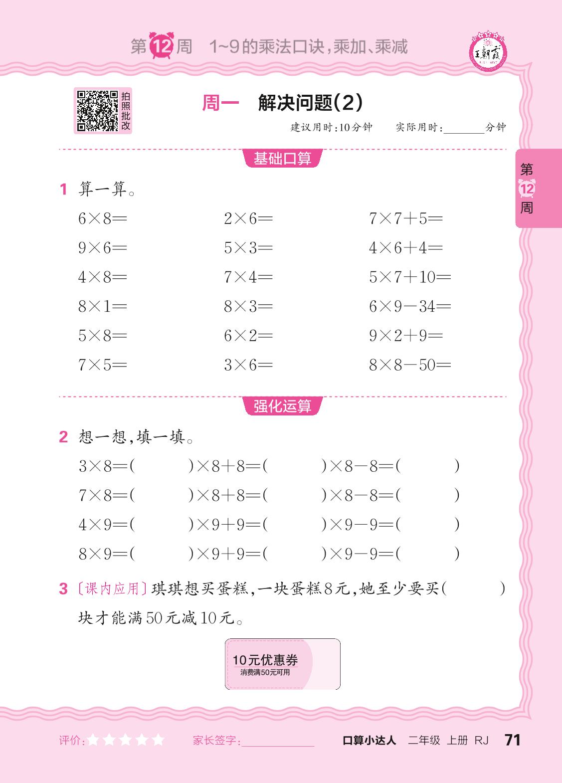 2024秋上册二年级数学人教版 口算计算专练 第12周