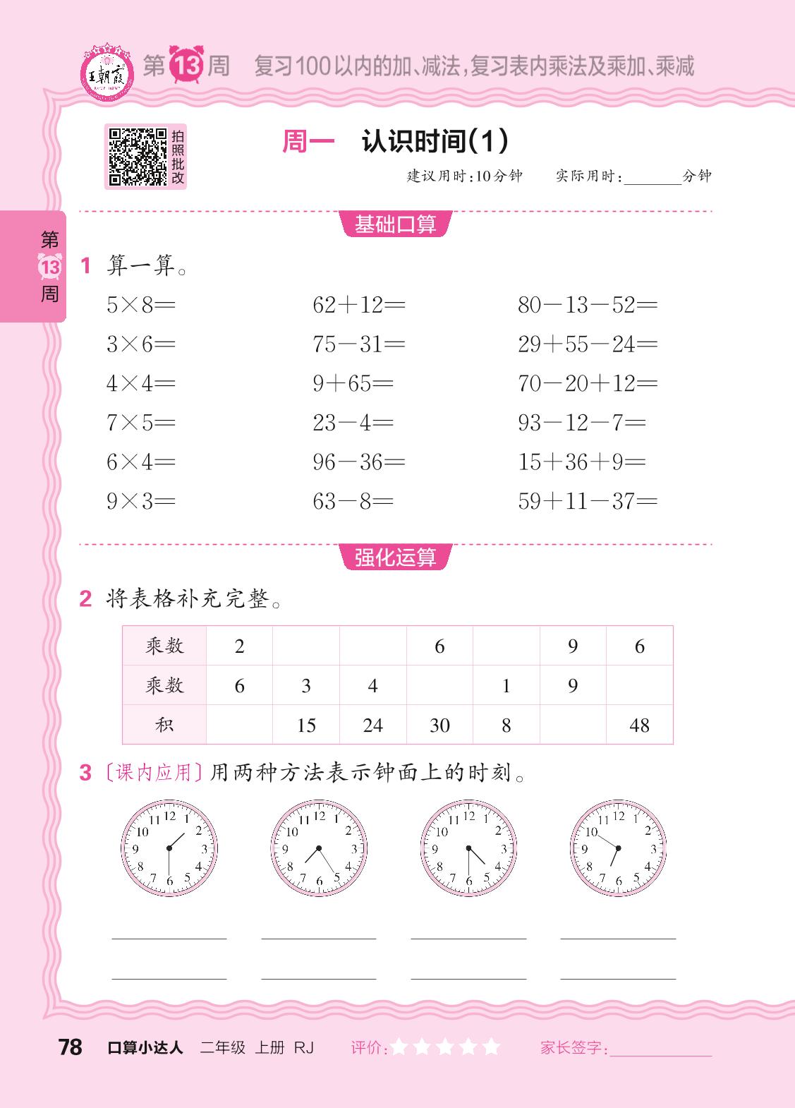 2024秋上册二年级数学人教版 口算计算专练 第13周