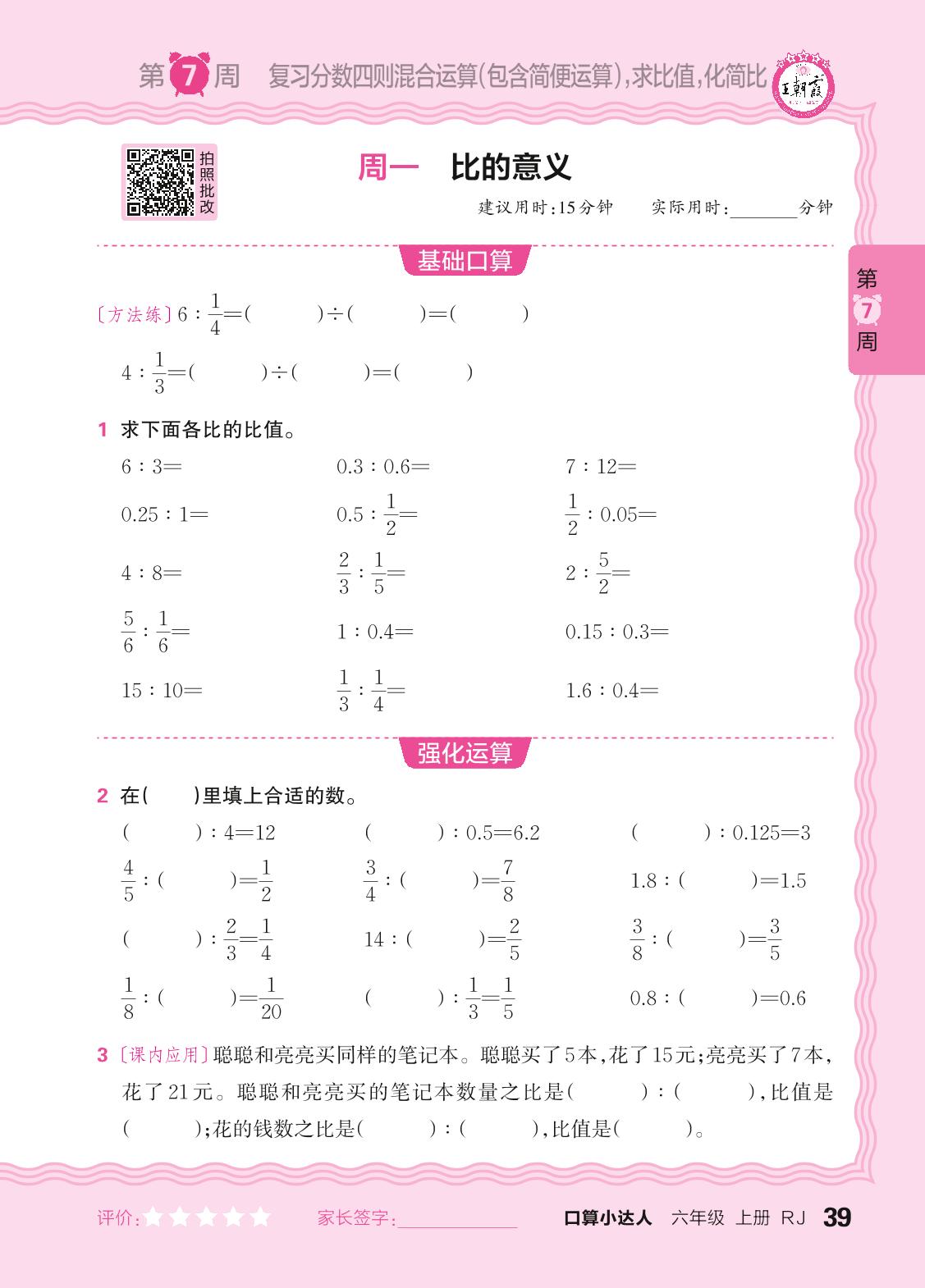2024秋上册六年级数学人教版 口算计算专练 第7周