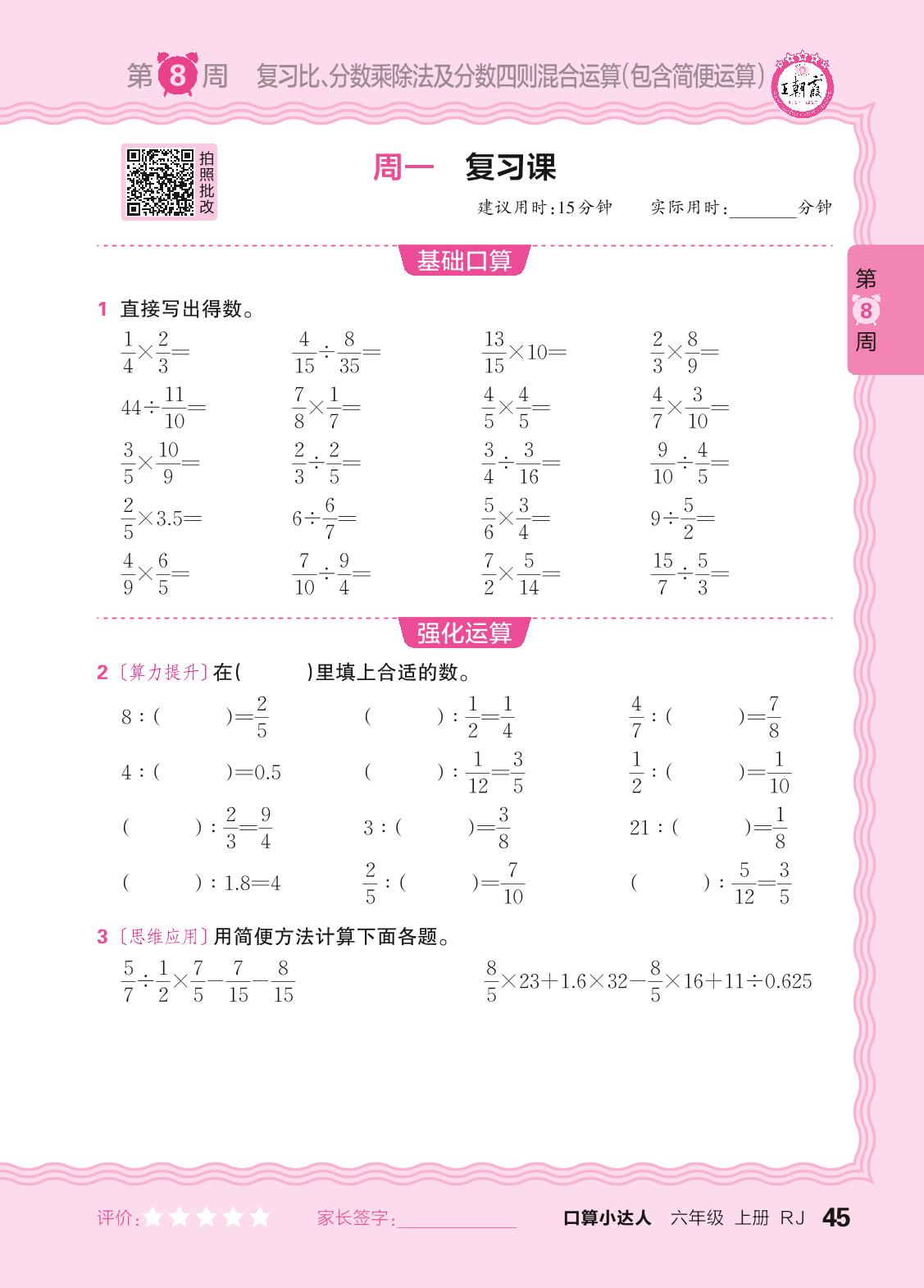2024秋上册六年级数学人教版 口算计算专练 第8周