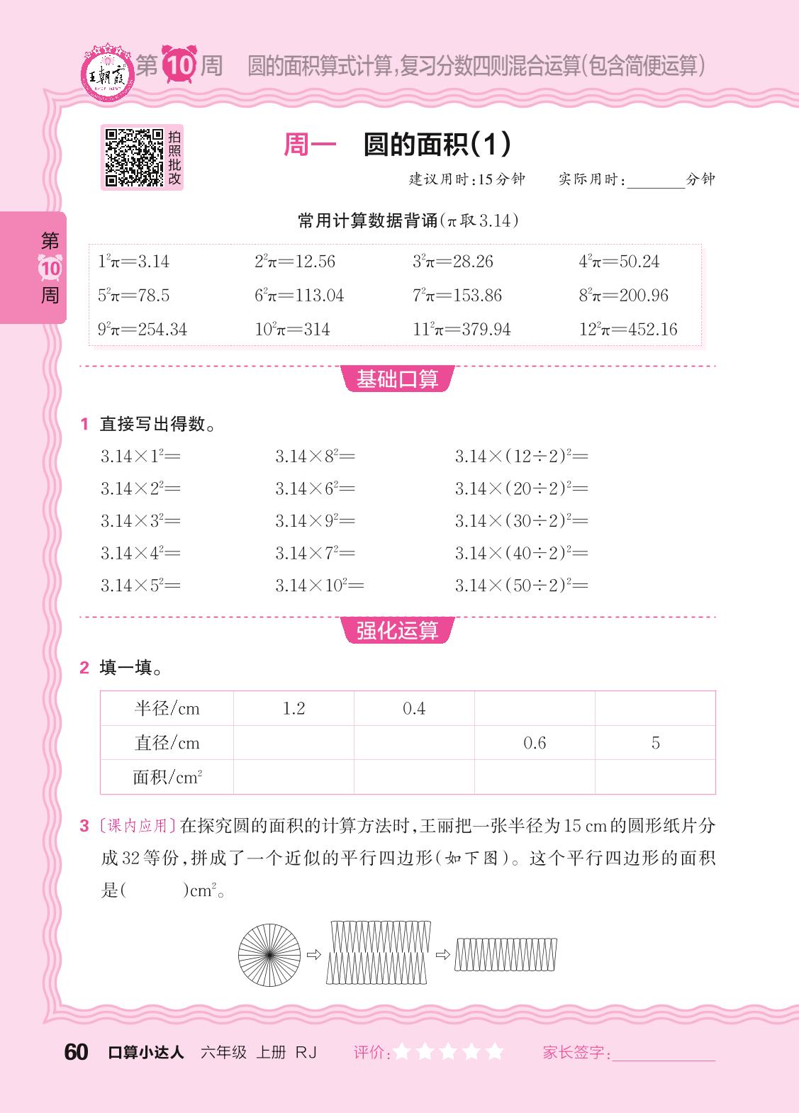 2024秋上册六年级数学人教版 口算计算专练 第10周