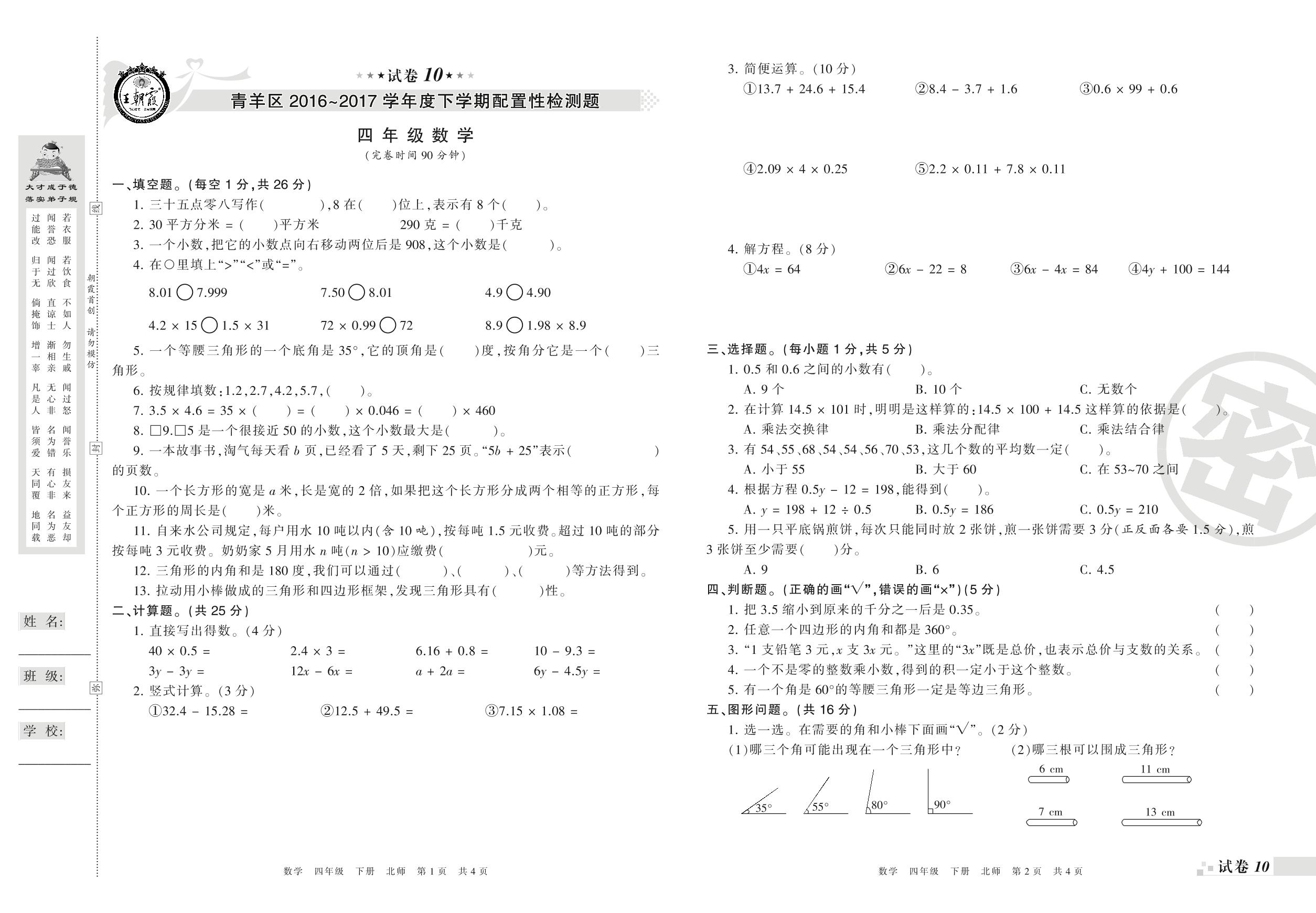 2016-2017学年第二学期成都市青羊区四年级数学试卷(北师版)【10】