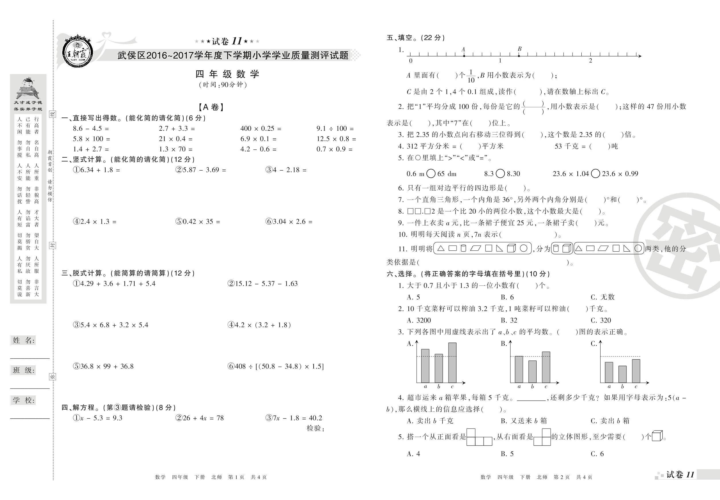 2016-2017学年第二学期成都市武侯区四年级数学试卷(北师版)【11】