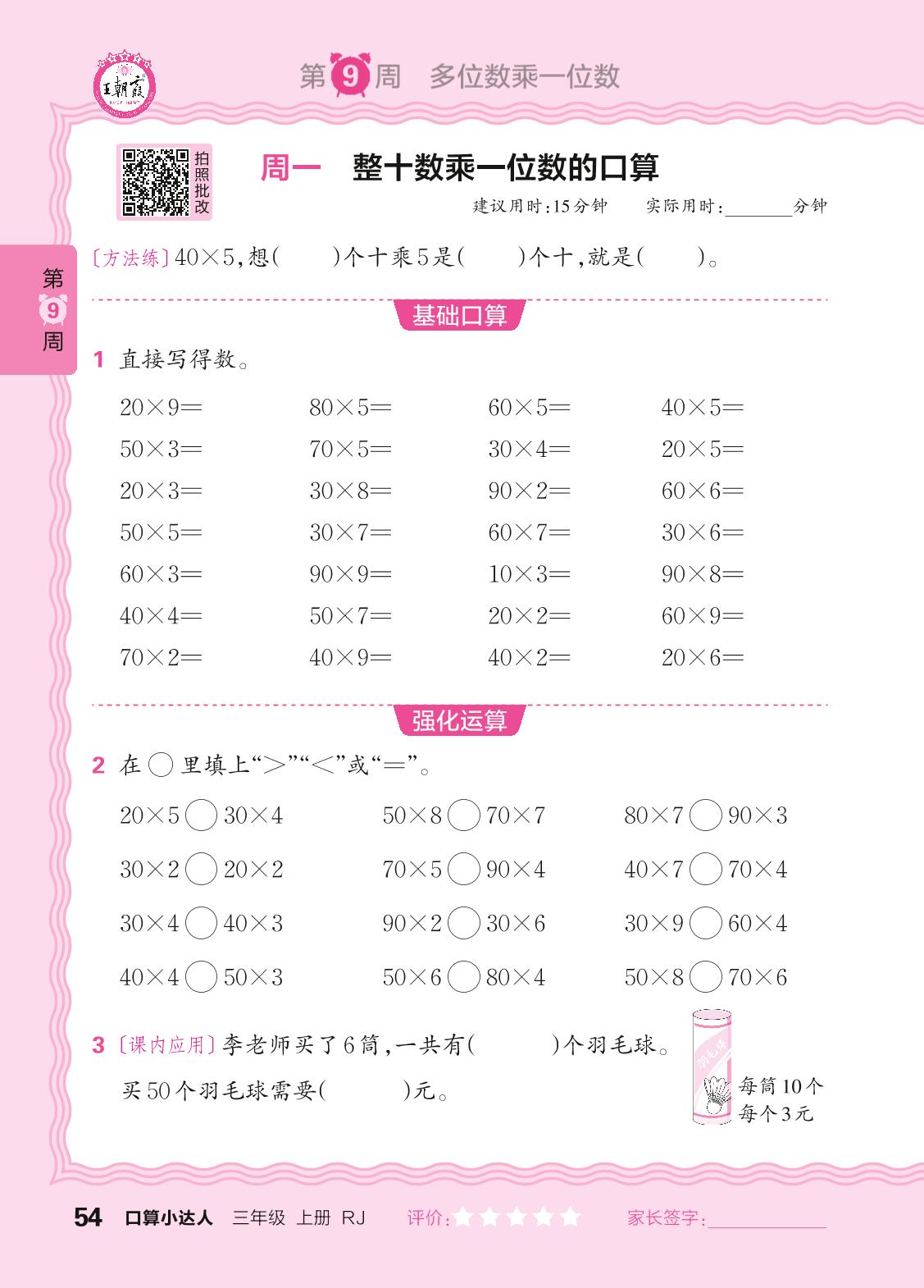 2024秋上册三年级数学人教版 口算计算专练 第9周