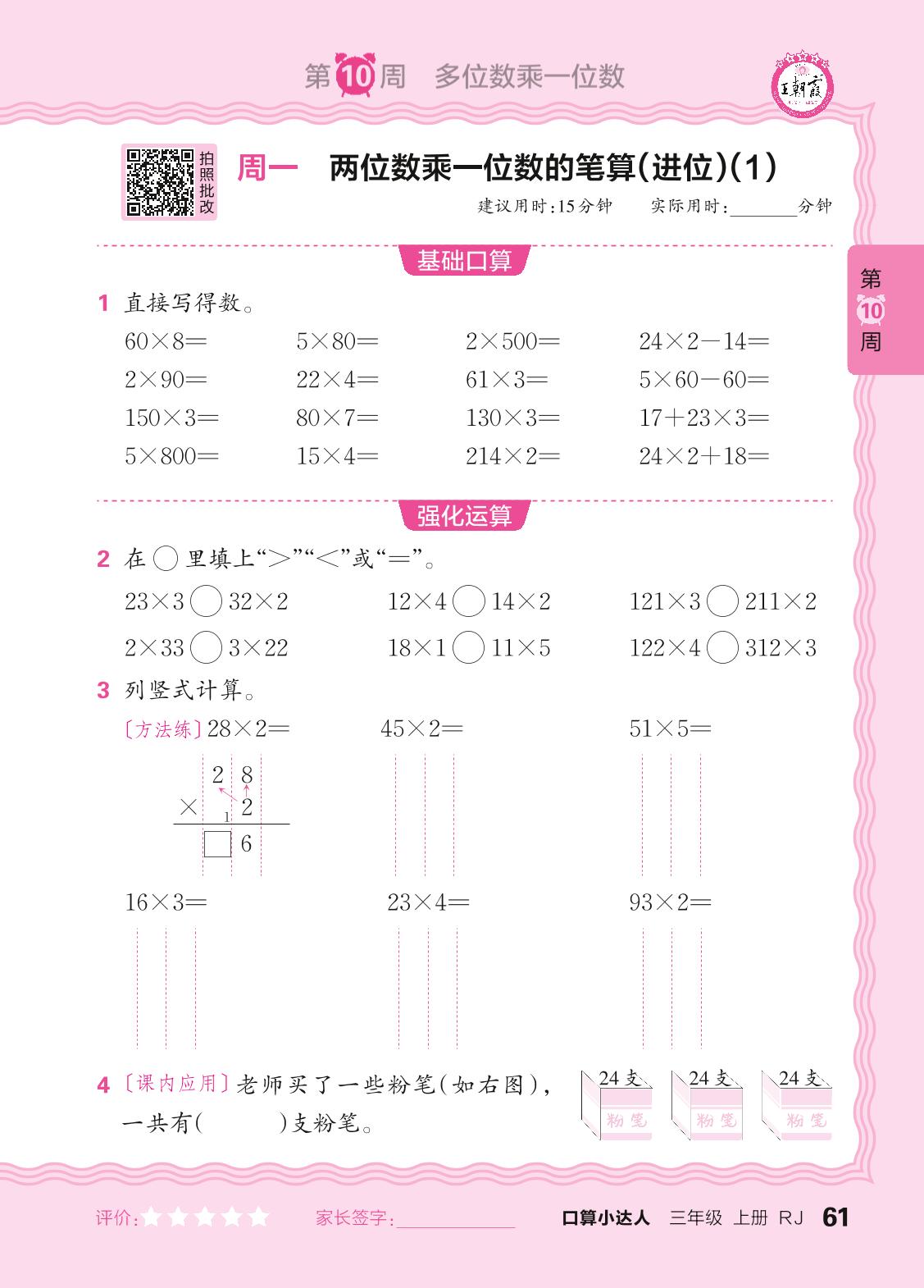 2024秋上册三年级数学人教版 口算计算专练 第10周