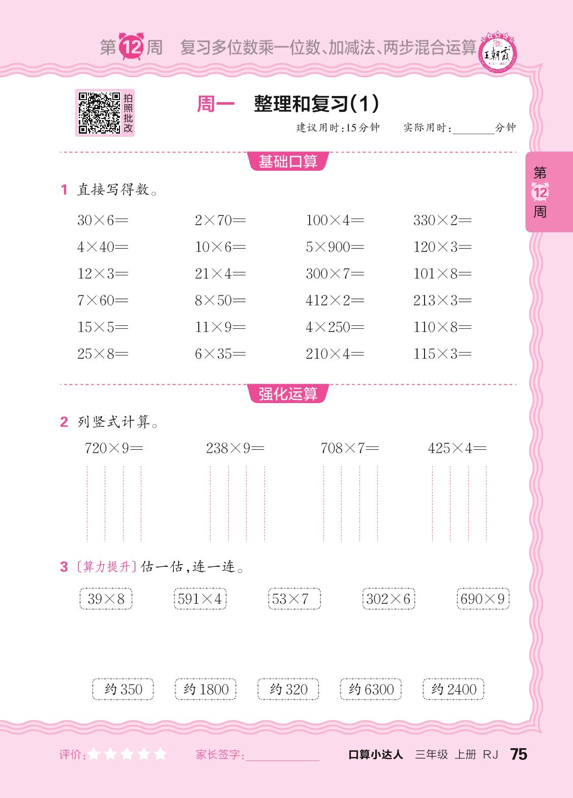 2024秋上册三年级数学人教版 口算计算专练 第12周
