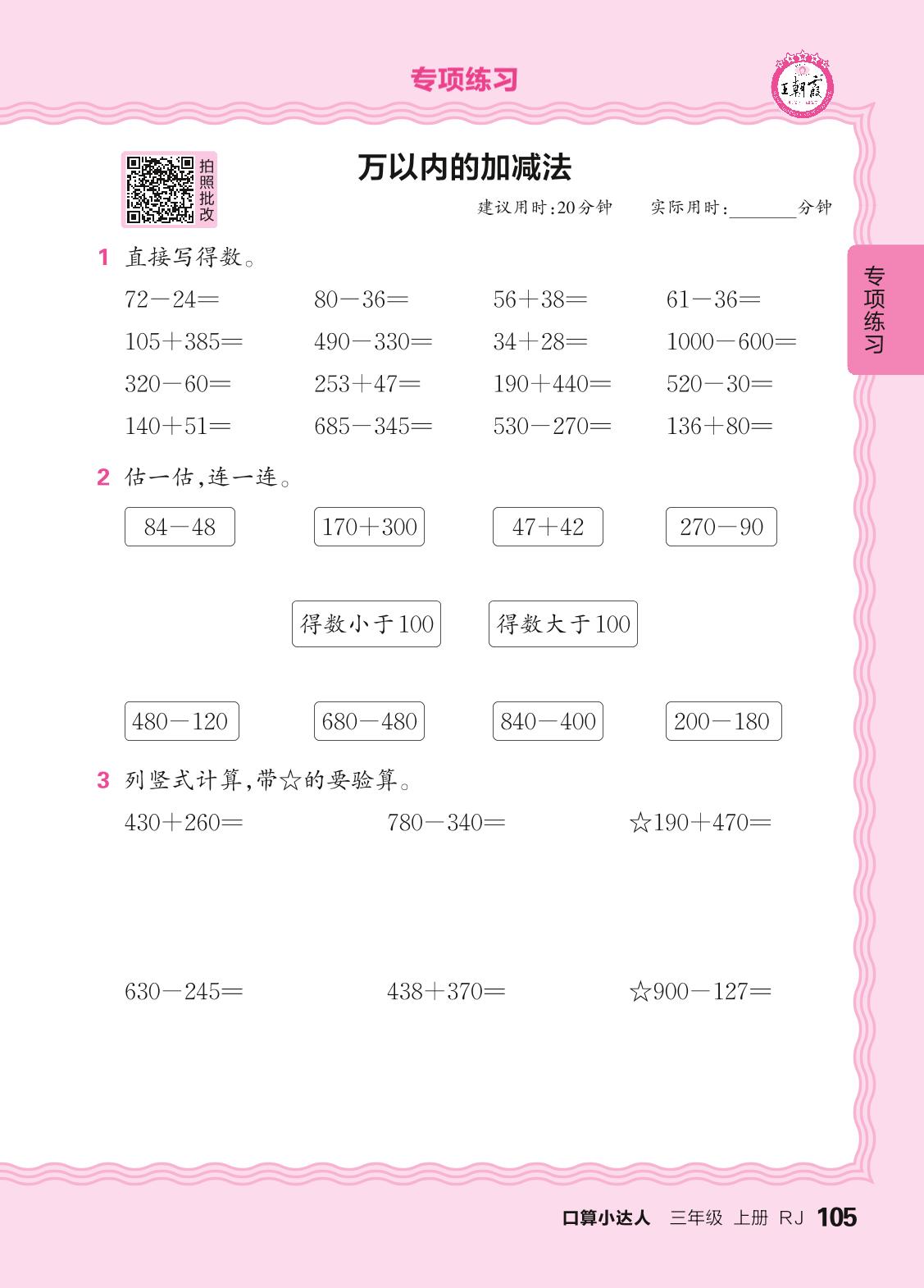 2024秋上册三年级数学人教版 口算计算专练 专项练习