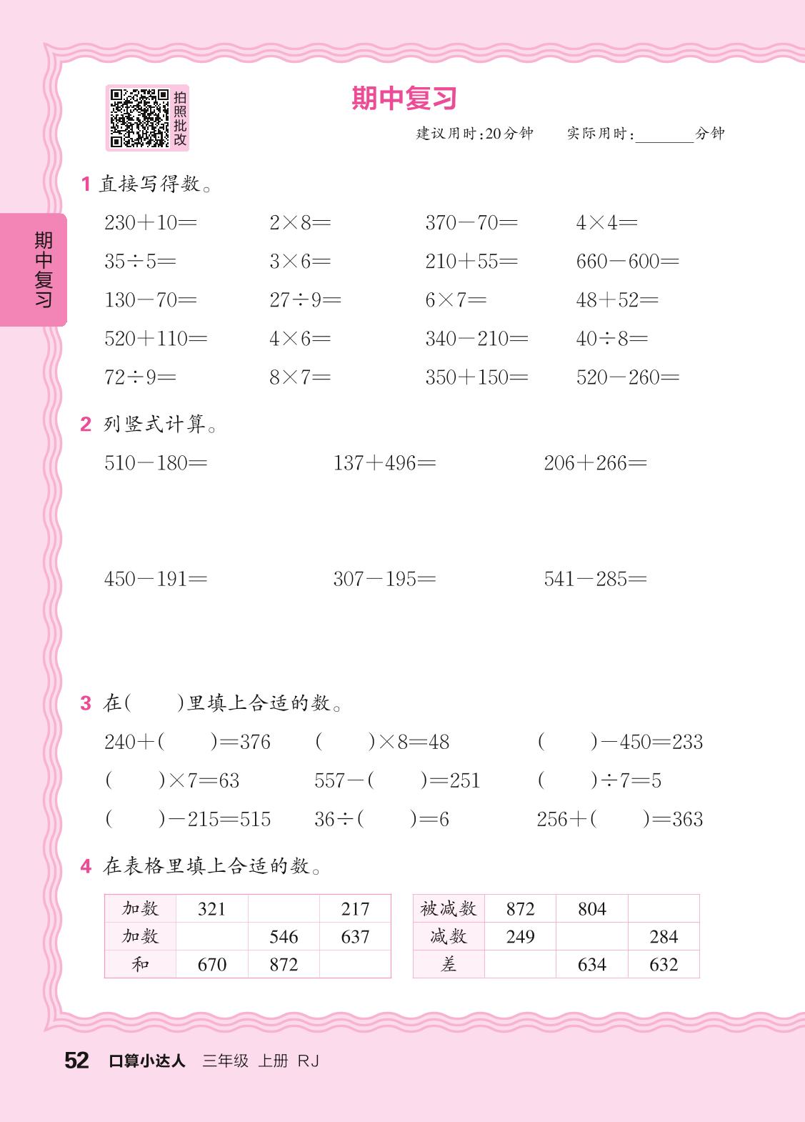2024秋上册三年级数学人教版 期中复习(计算专练)