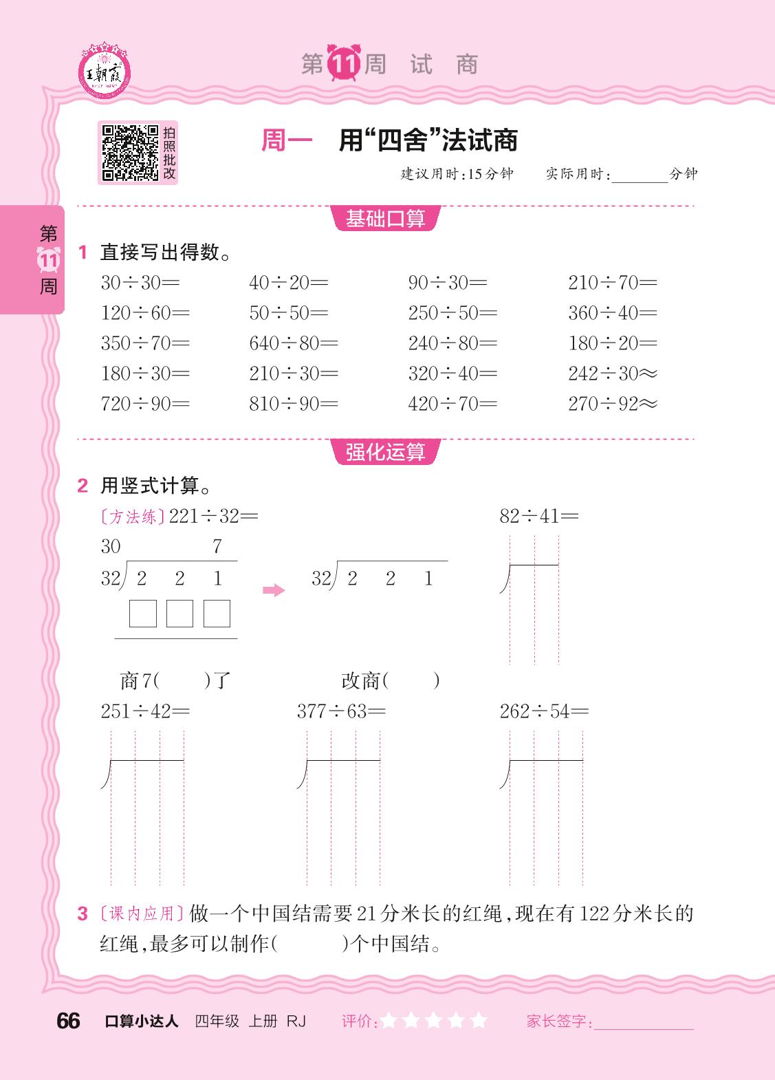 2024秋上册四年级数学人教版 口算计算专练 第11周