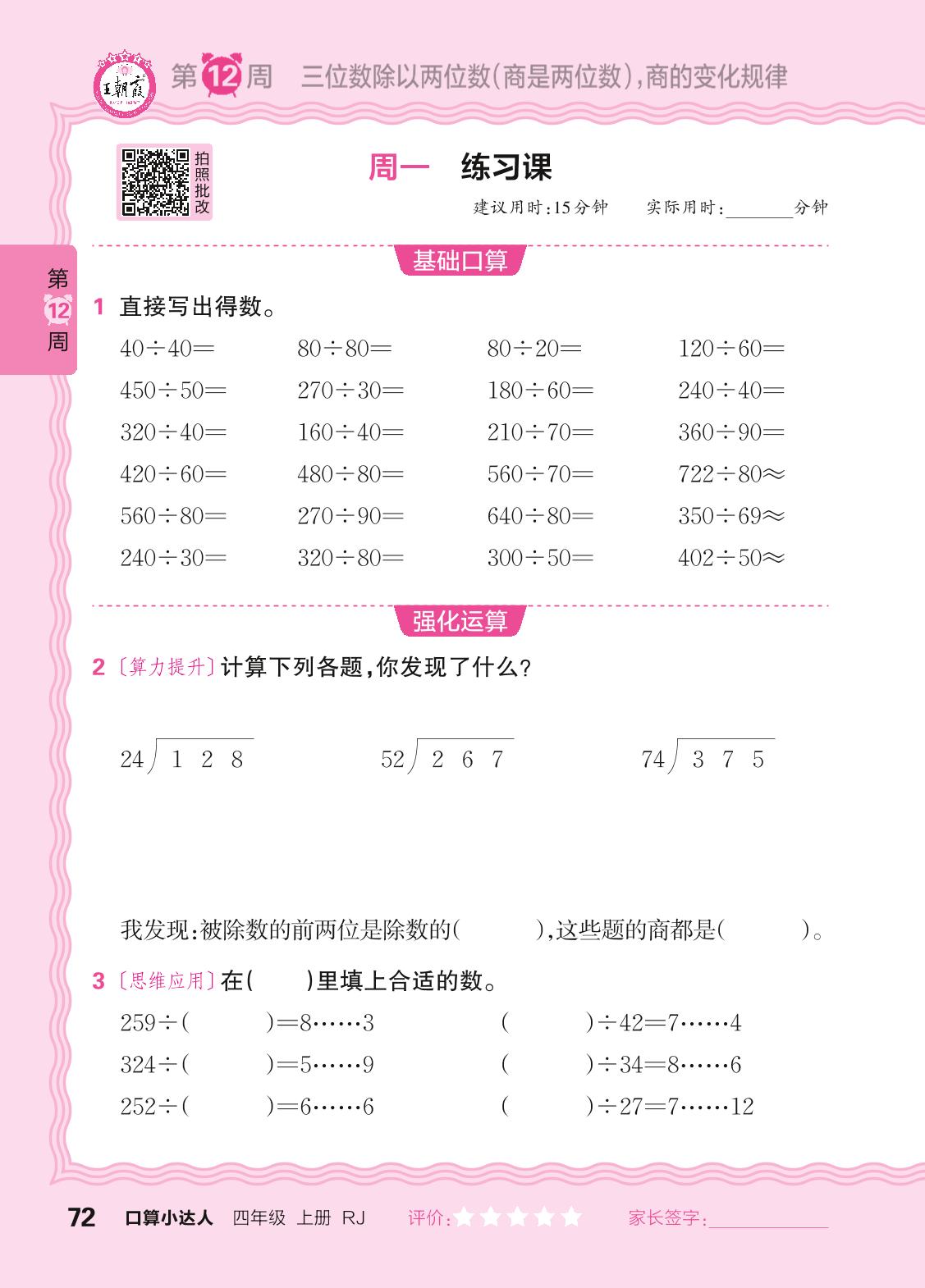 2024秋上册四年级数学人教版 口算计算专练 第12周