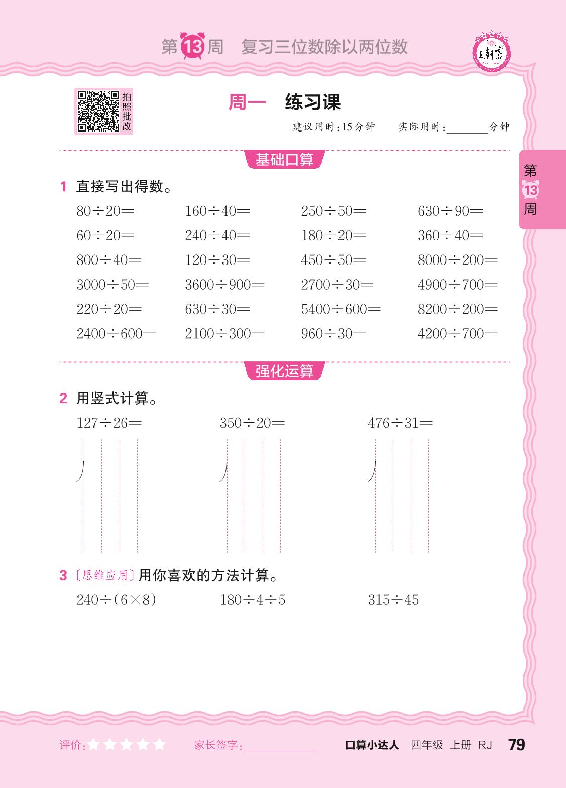 2024秋上册四年级数学人教版 口算计算专练 第13周