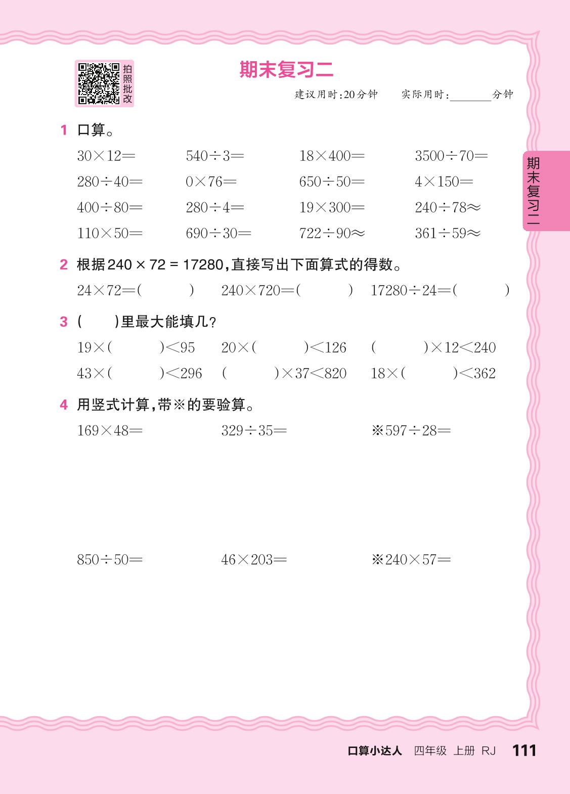 2024秋上册四年级数学人教版 期末复习二(计算专练)