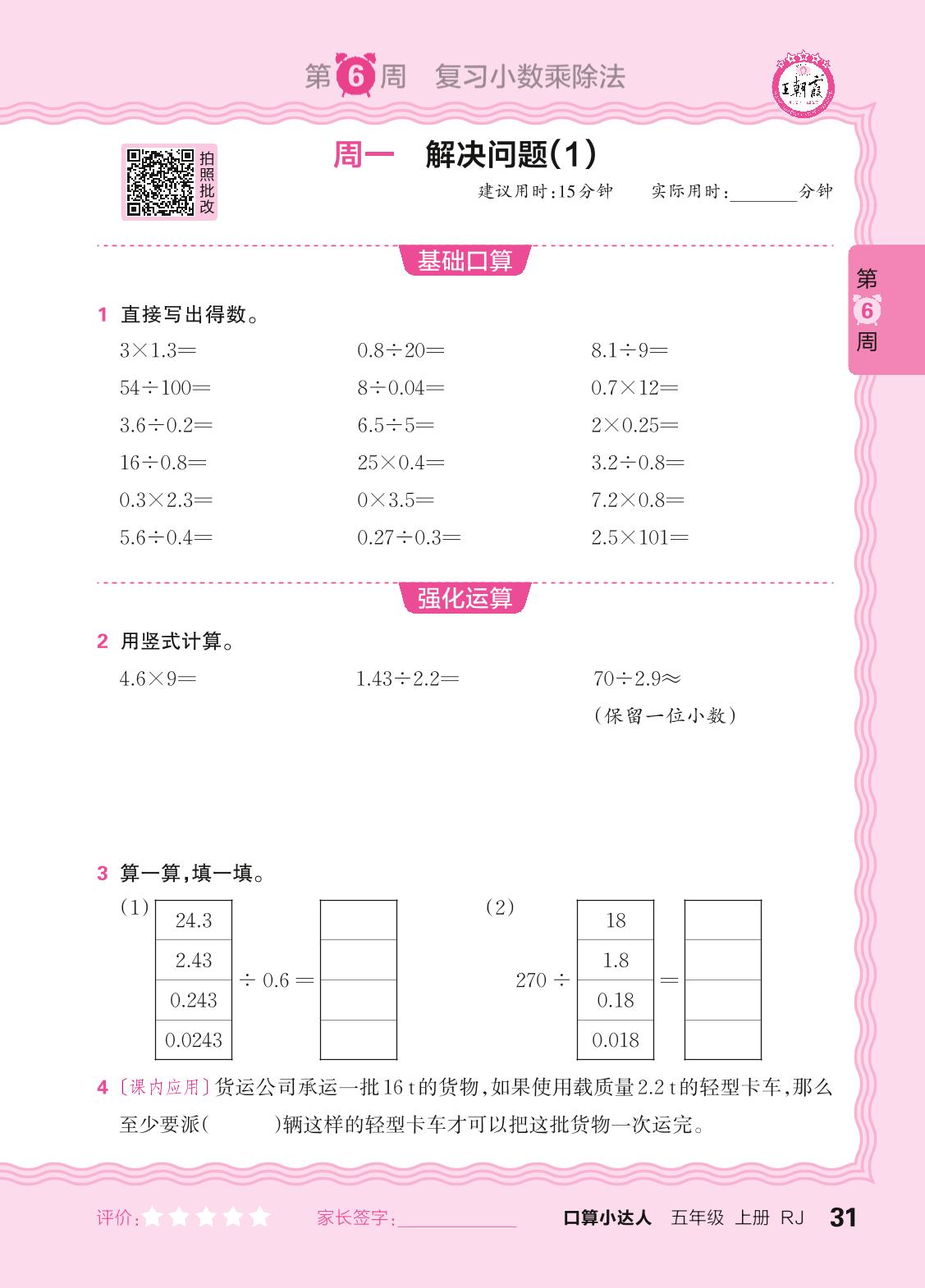 2024秋上册五年级数学人教版 口算计算专练 第6周
