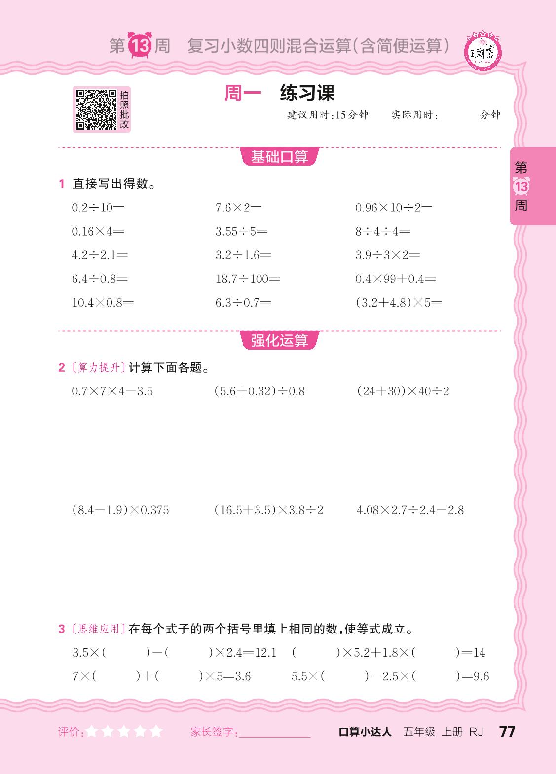 2024秋上册五年级数学人教版 口算计算专练 第13周