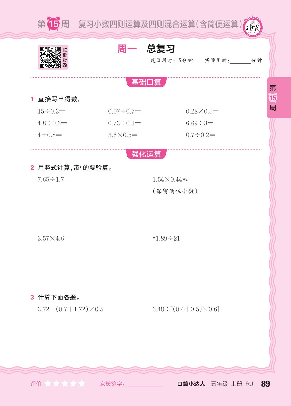 2024秋上册五年级数学人教版 口算计算专练 第15周