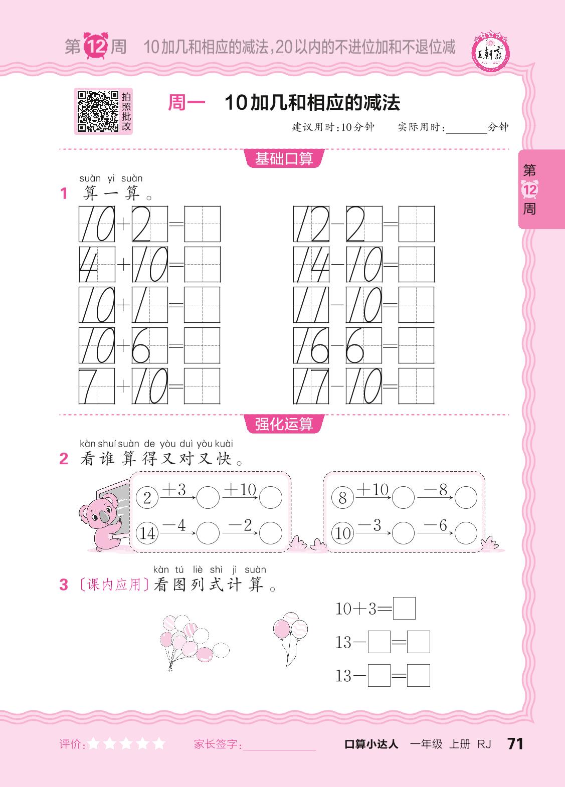 2024秋上册一年级数学人教版 口算计算专练 第12周