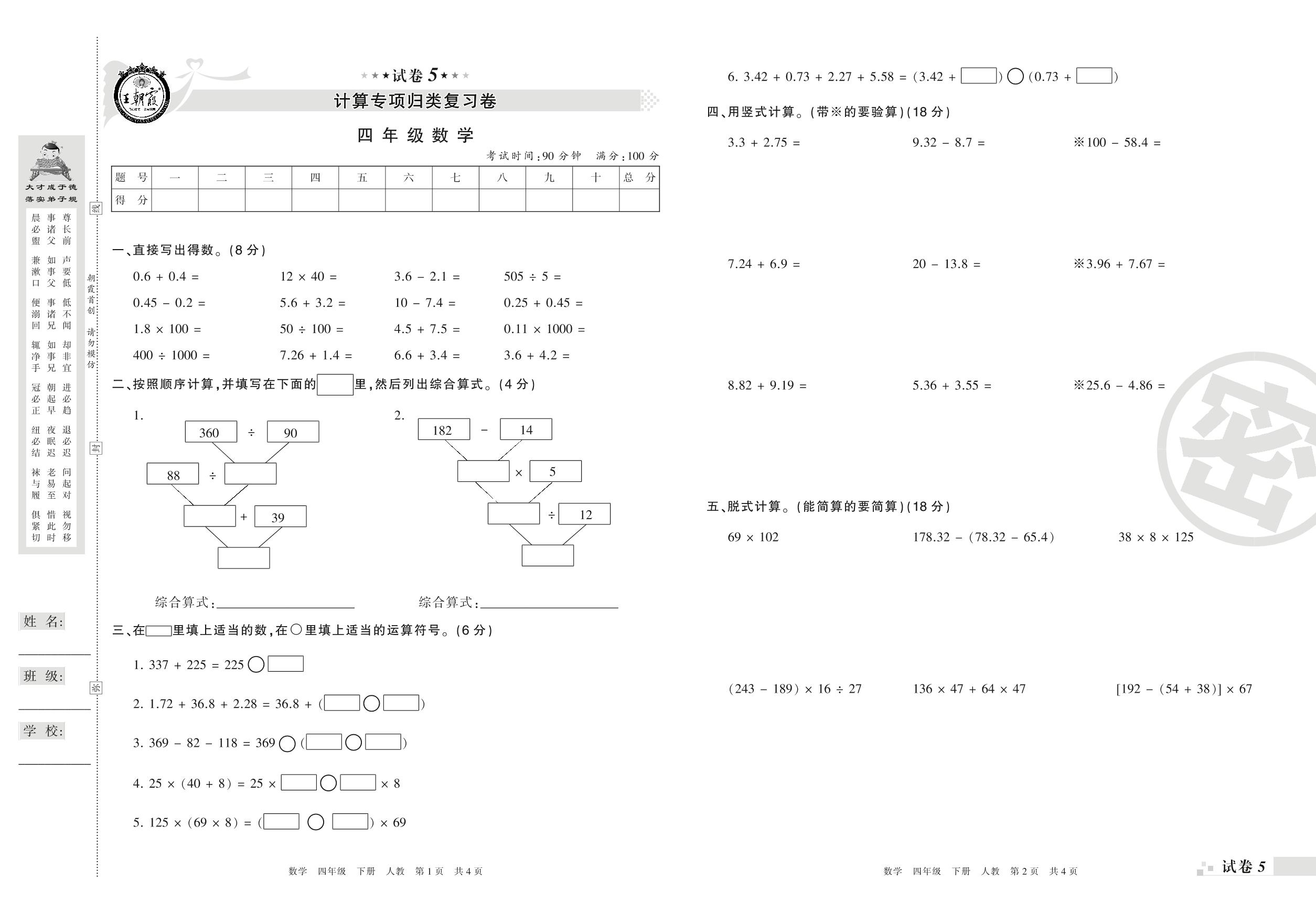 王朝霞期末专项卷——计算专项归类复习卷四年级下册数学(人教版)_R210804161019【5】