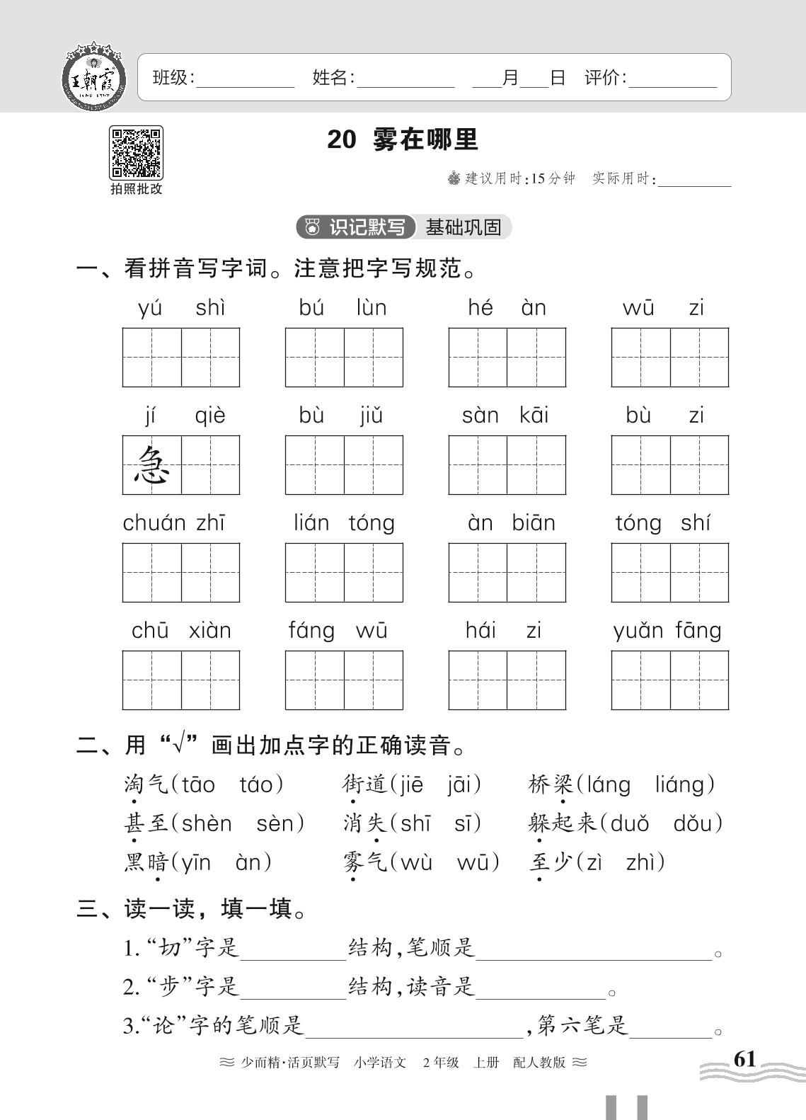 2024秋上册二年级语文人教版 第七单元——20. 雾在哪里